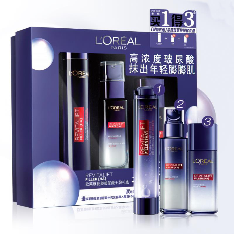 L'oreal/欧莱雅 复颜玻尿酸水光盈补水滋润3件套 膨润精华液75ml+导入晶露65ml+乳液50ml
