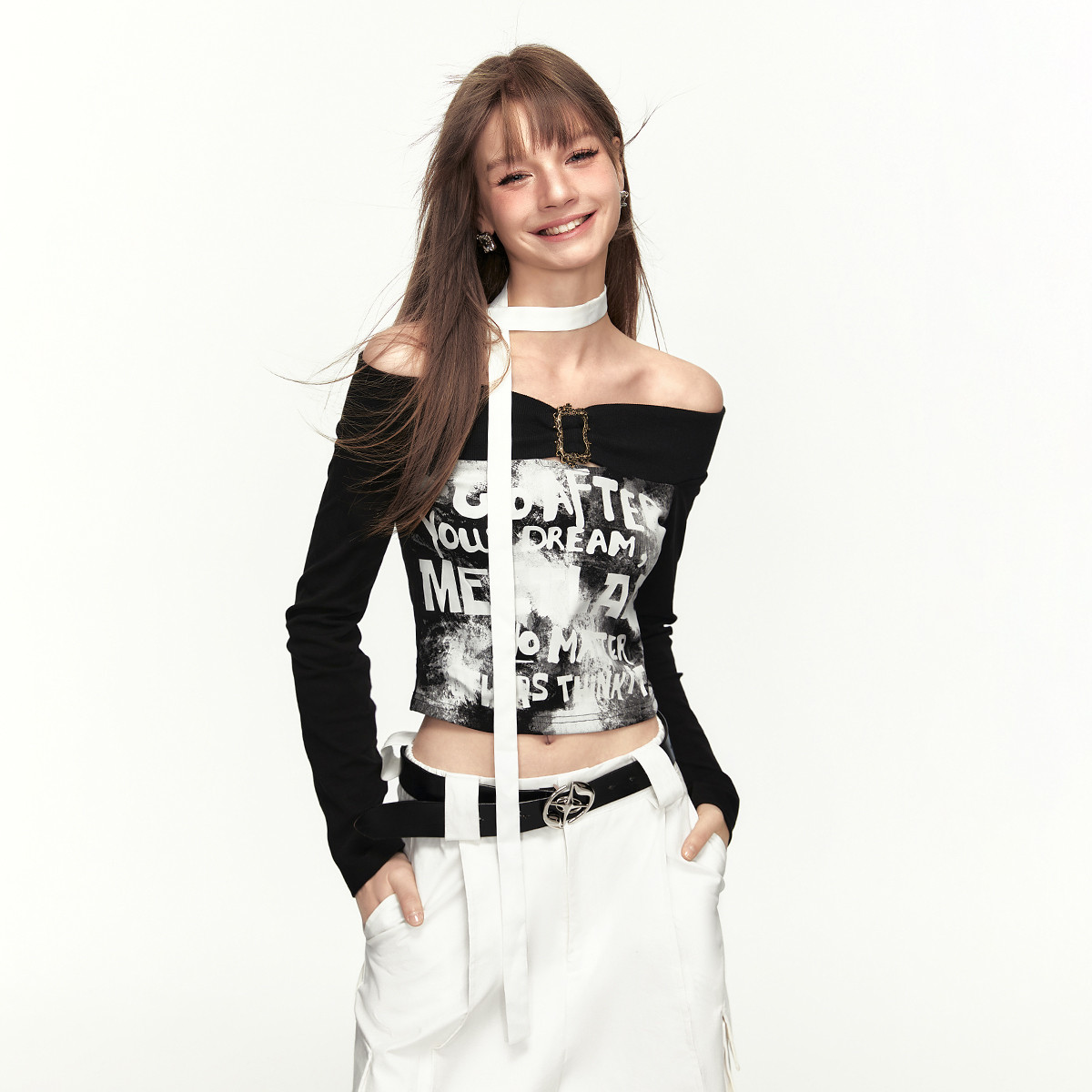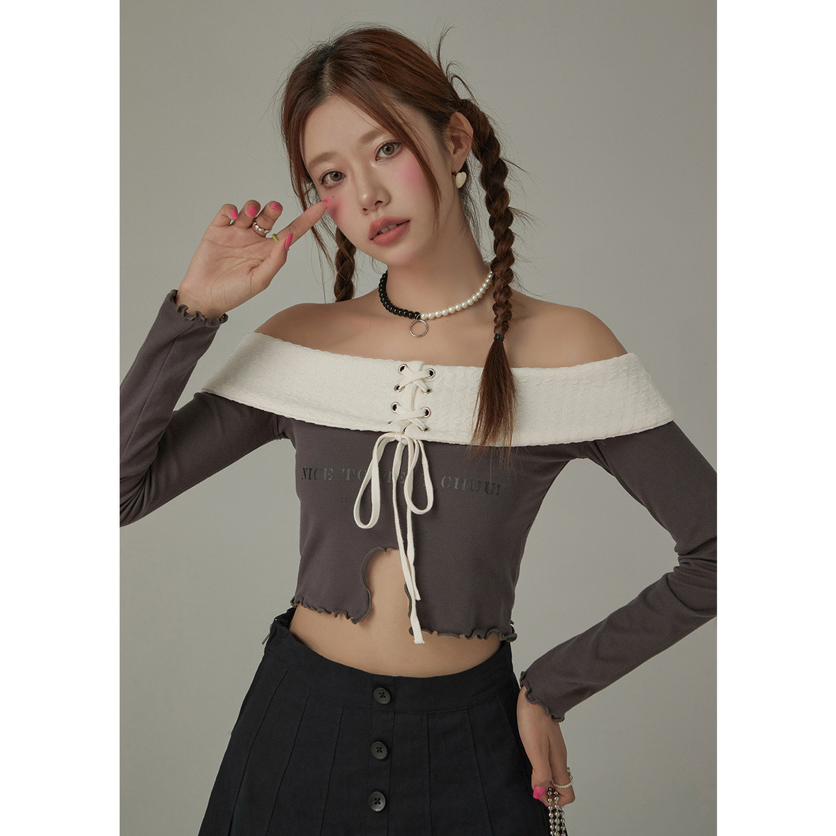 撞色系带长袖T恤女春秋字母开叉一字肩木耳边上衣 450387