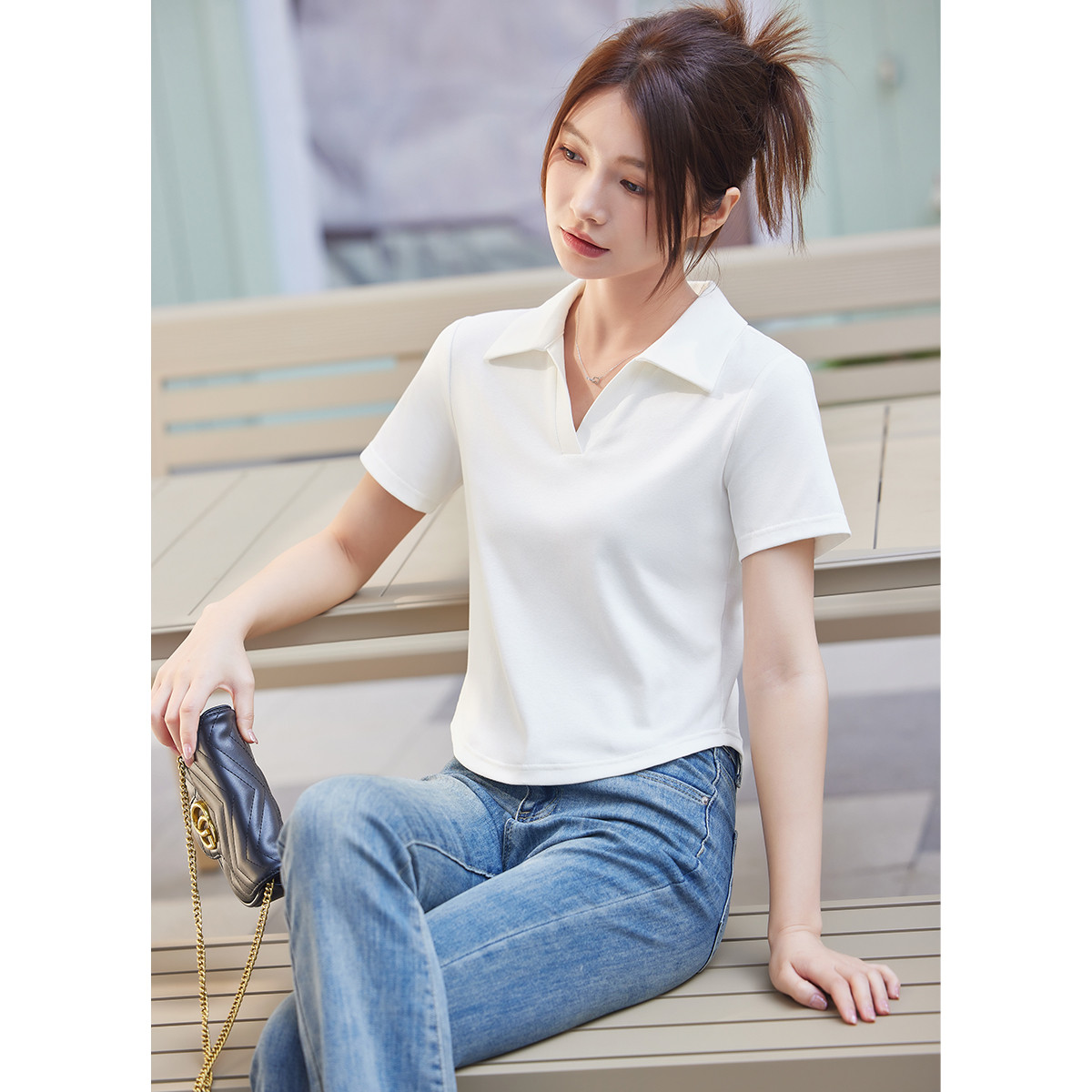 米子旗夏季款polo领纯色T恤女短款修身短袖上衣 607322