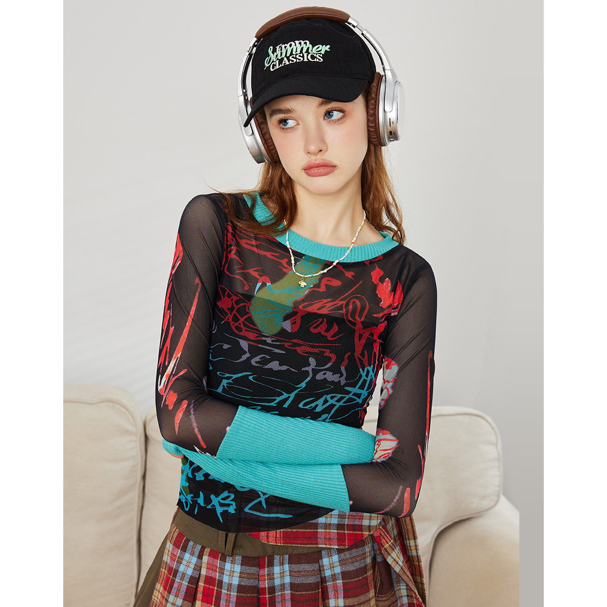 满印网纱拼接设计感辣妹风女式打底衫春季长袖上衣 947165
