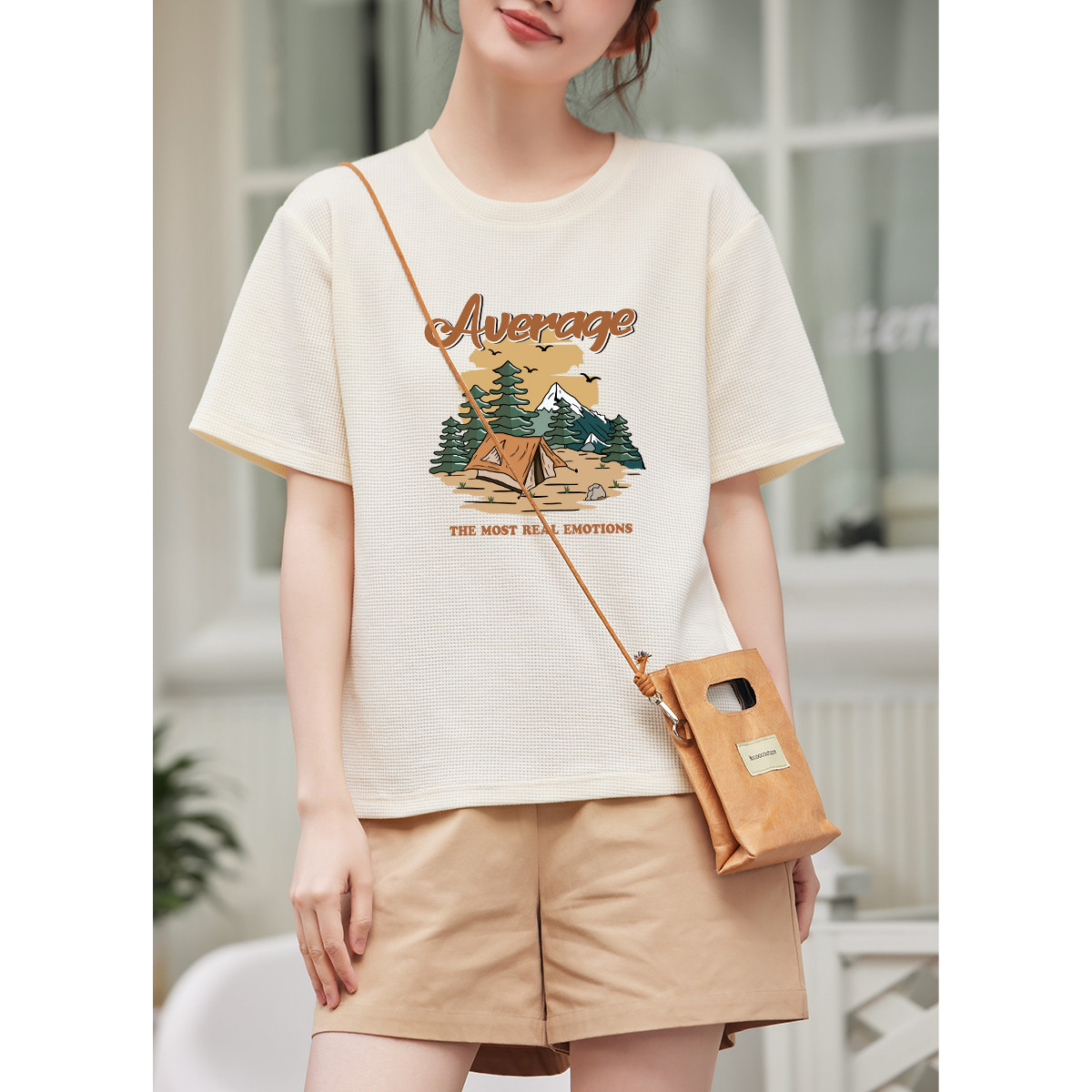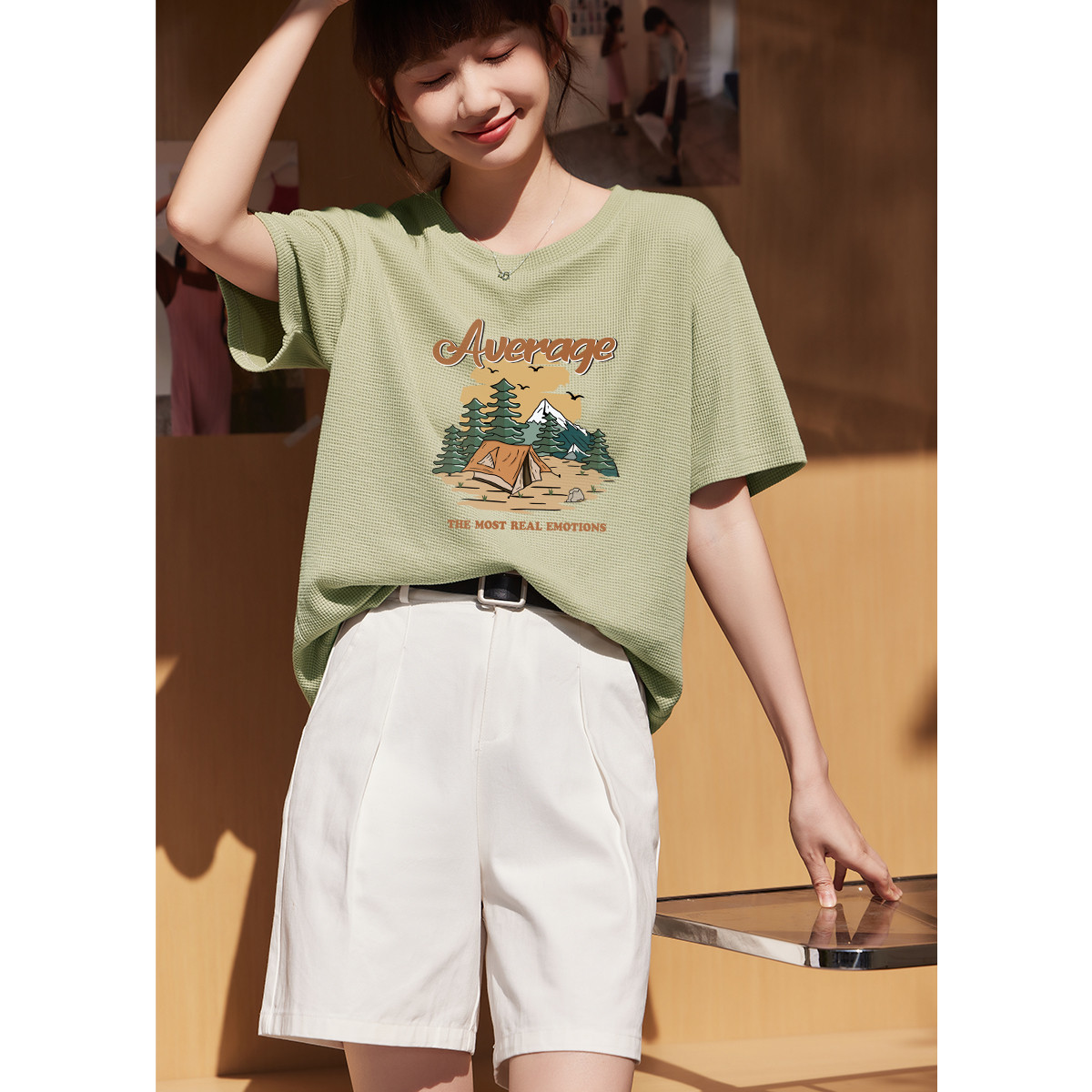米子旗夏装款印花圆领T恤女宽松华夫格短袖上衣 992922