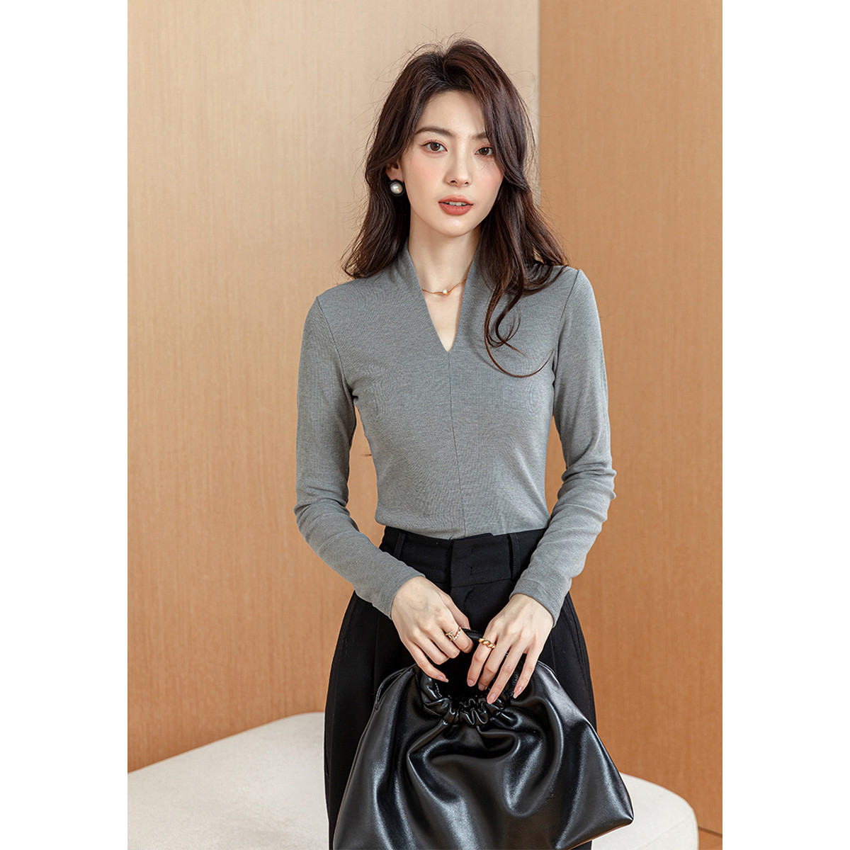V领长袖针织衫女修身洋气打底衫内搭针织毛衣 464643
