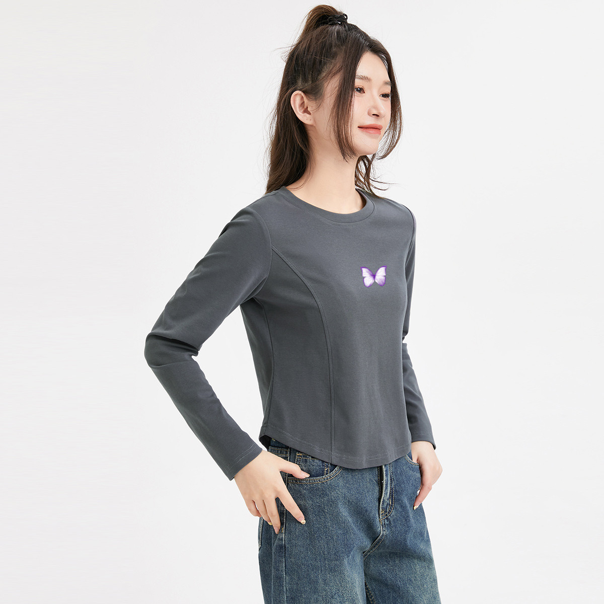 米子旗春秋圆领T恤女撞色蝴蝶印花基础款百搭潮 426586
