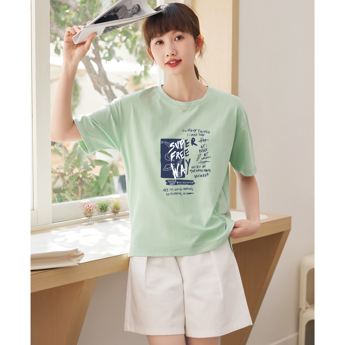 米子旗夏季圆领字母印花女式大码T恤宽松休闲慵懒风短袖上衣 516506