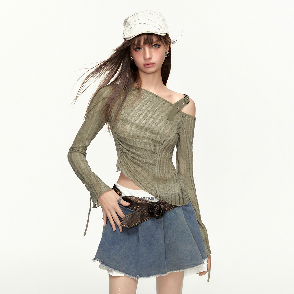 【2024秋装】甜辣风格气质斜领露肩长袖T女网纱外搭罩小衫 985556