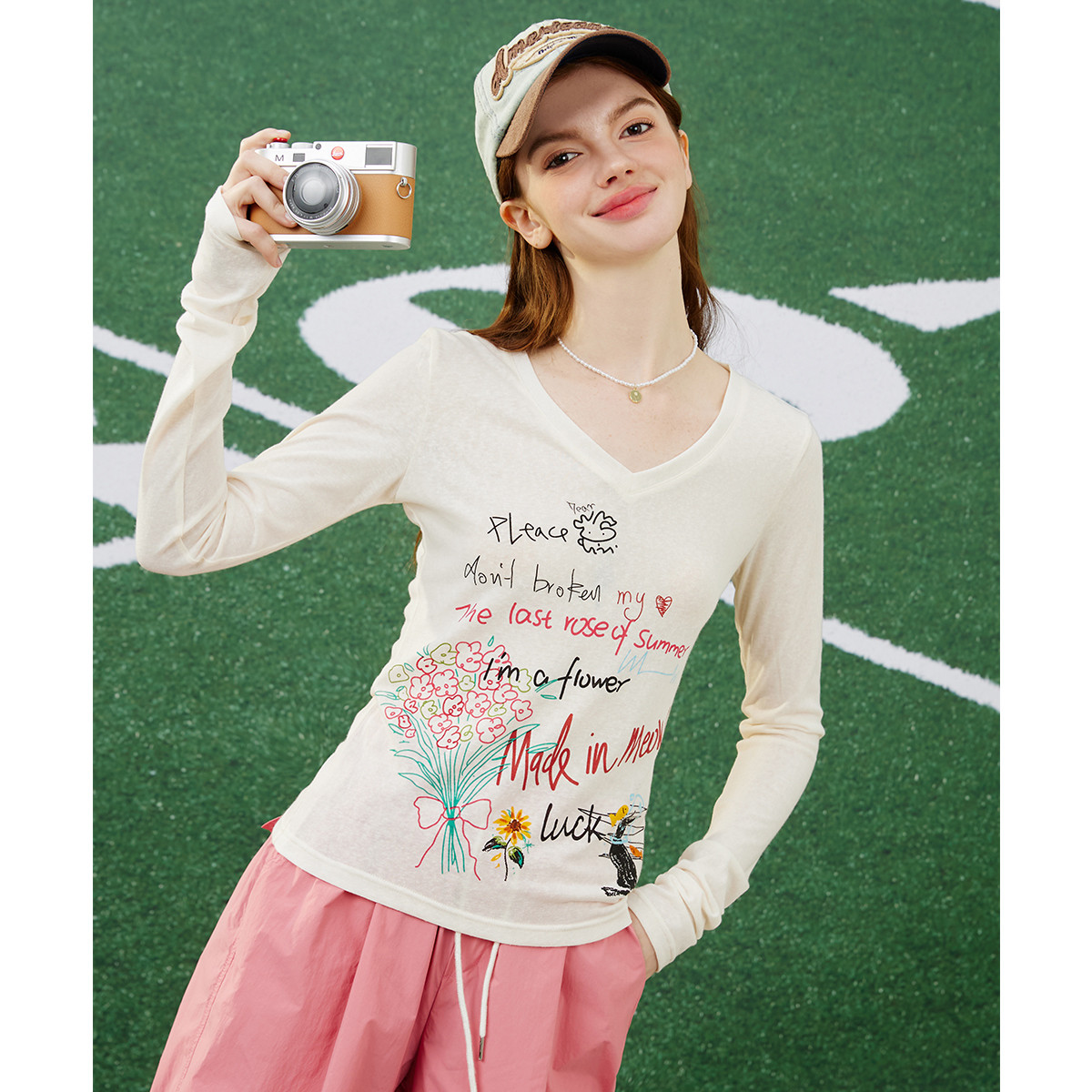 薄款涂鸦印花设计修身女式T恤春季V领正肩长袖上衣 852765
