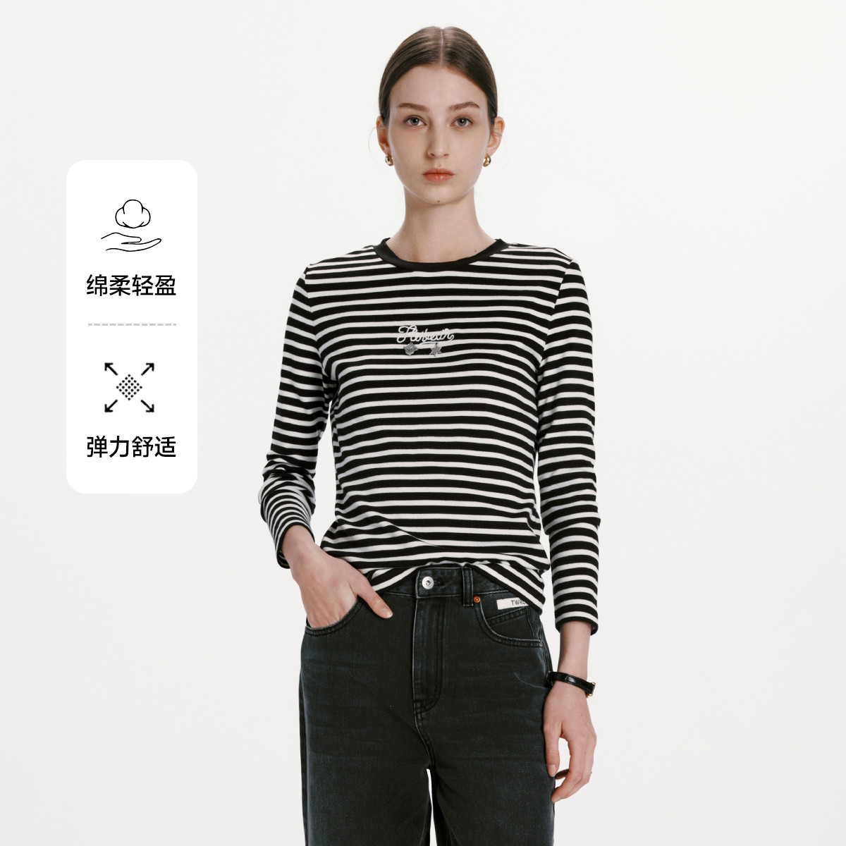 小熊女装长袖T恤春秋款休闲保暖条纹打底衫女 328449