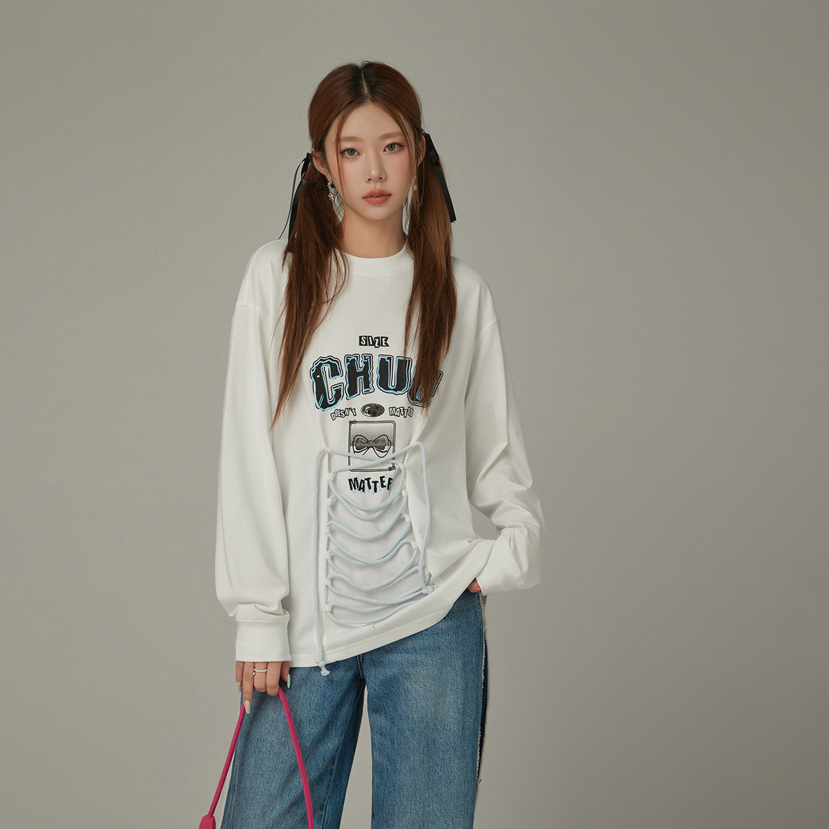 宽松抽绳T恤女春秋设计感休闲字母印花上衣 231891