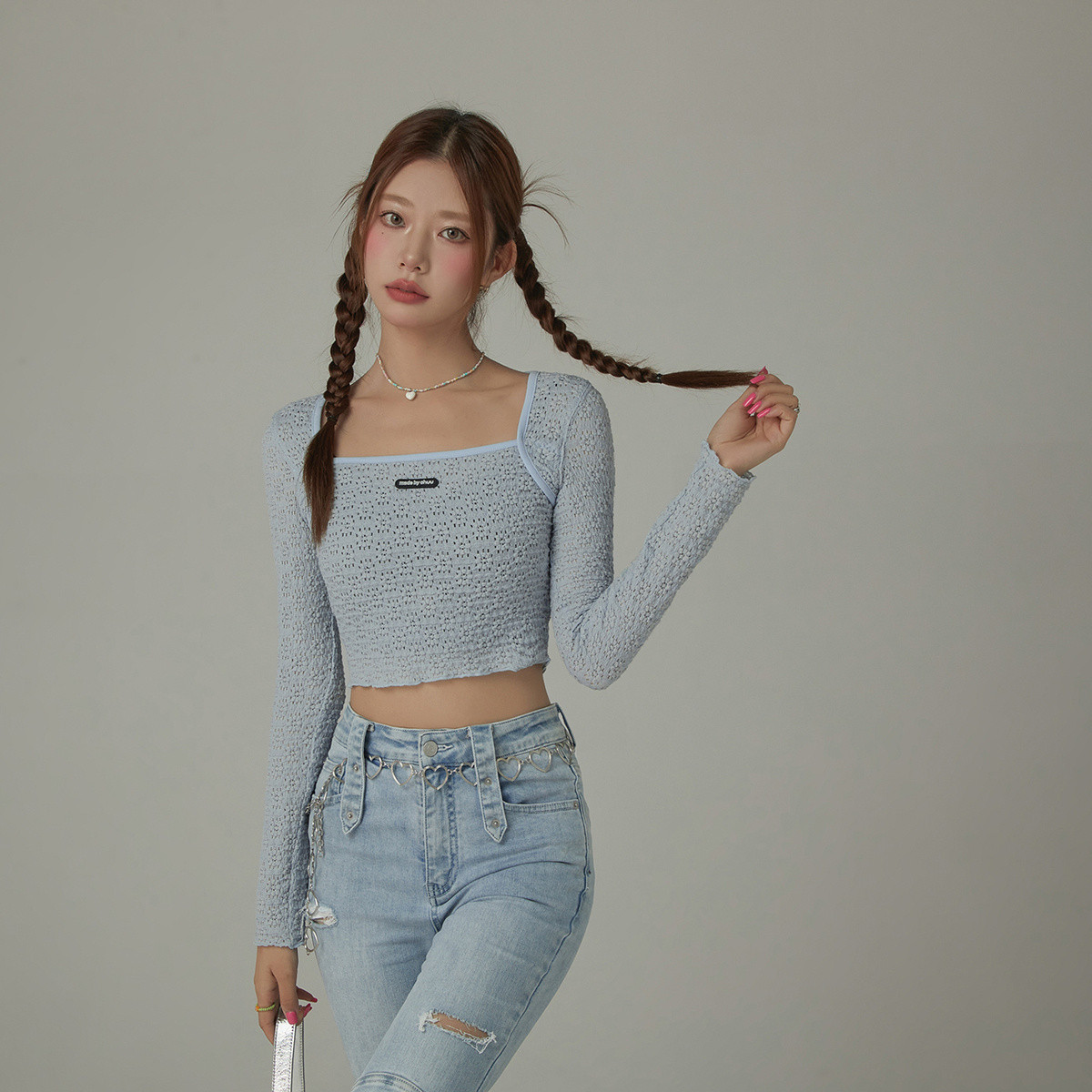 贴标镂空T恤女春秋设计感洋气百搭辣妹长袖短上衣 588819
