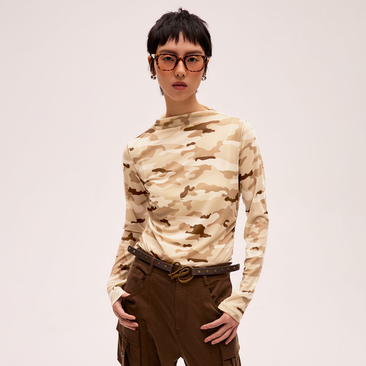 【修身短款】夏季半高领半透长袖迷彩T恤女 666330