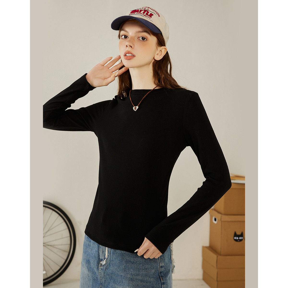 米子旗春秋季款圆领女士T恤纯色下摆开叉长袖上衣女 738586
