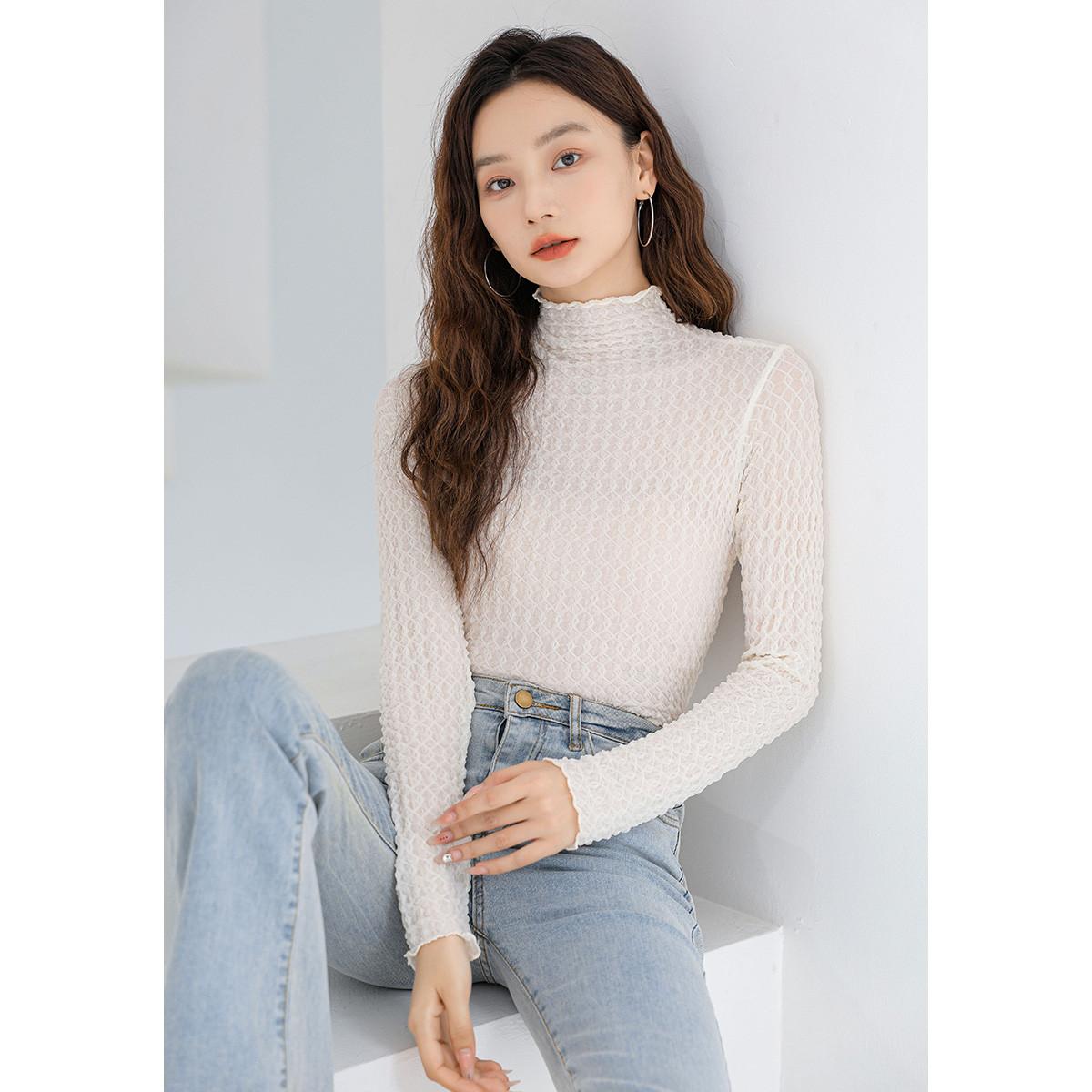 【专柜款】春夏修身半高领印花网纱微透长袖打底T恤女百搭时尚 974929