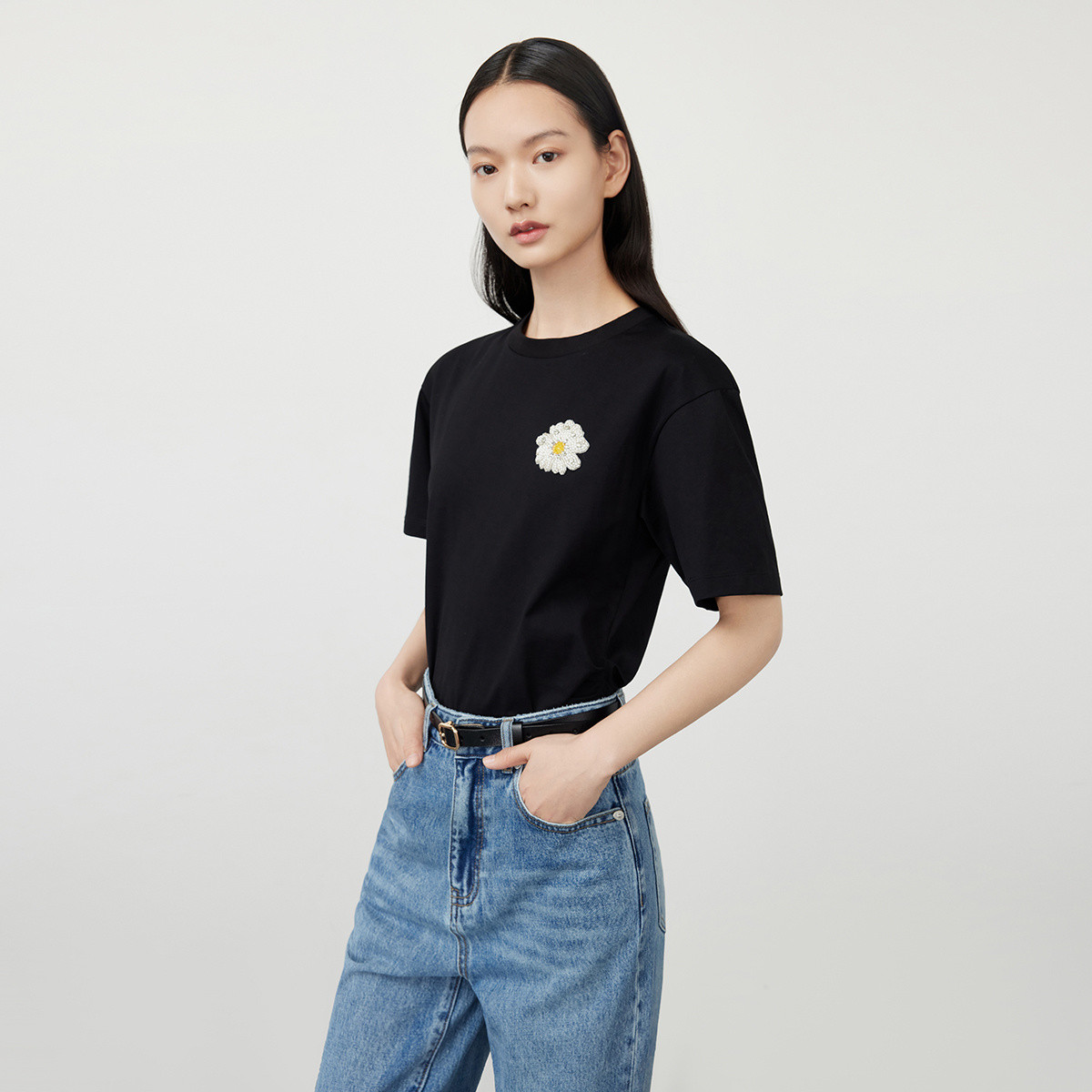 夏装刺绣设计感上衣不规则收褶短袖t恤女 133775