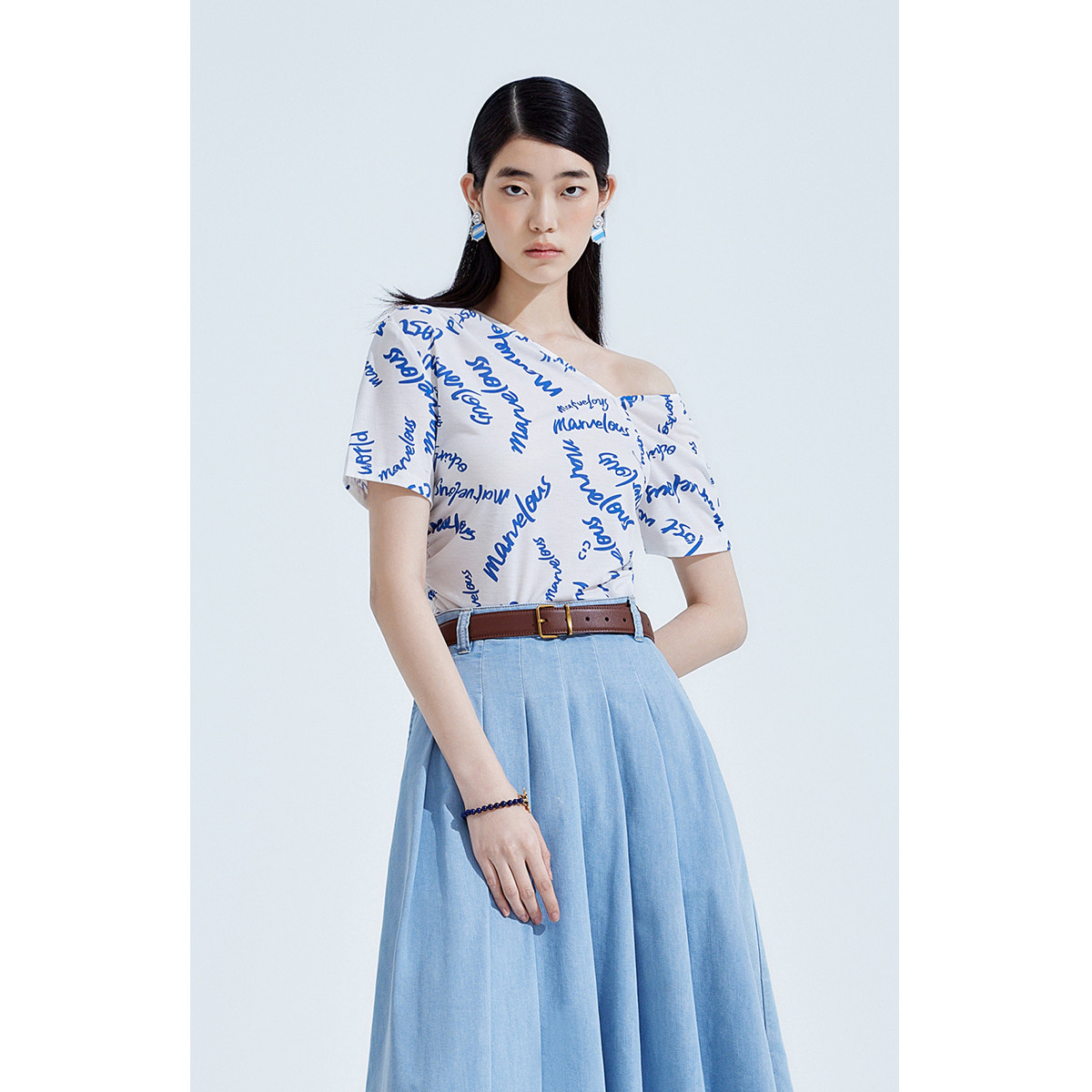 度假系列夏装 设计感小众斜露肩印花短袖t恤女 476239