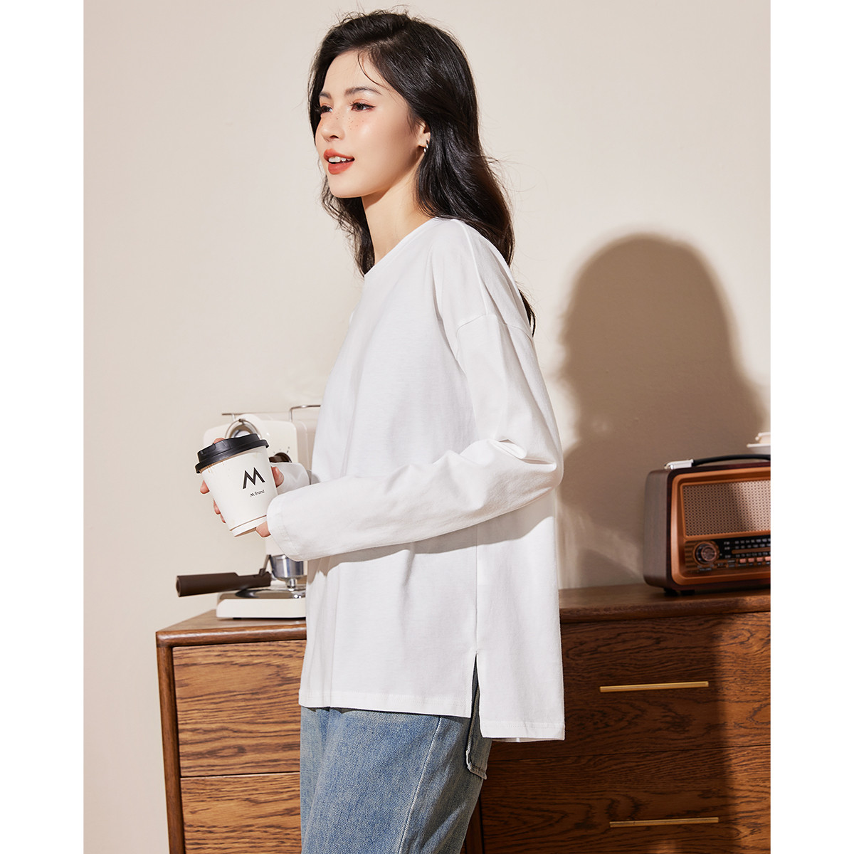 米子旗春秋款圆领女式T恤纯色宽松下摆开叉设计长袖上衣 544474