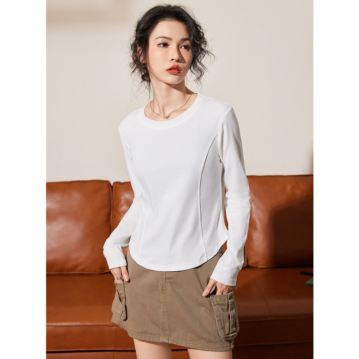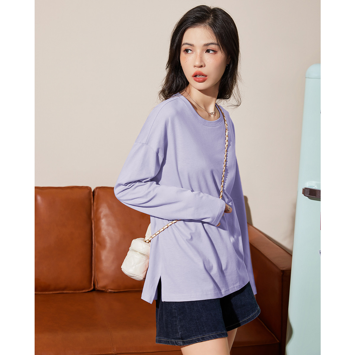 米子旗春秋款圆领女式T恤纯色宽松下摆开叉设计长袖上衣 544474
