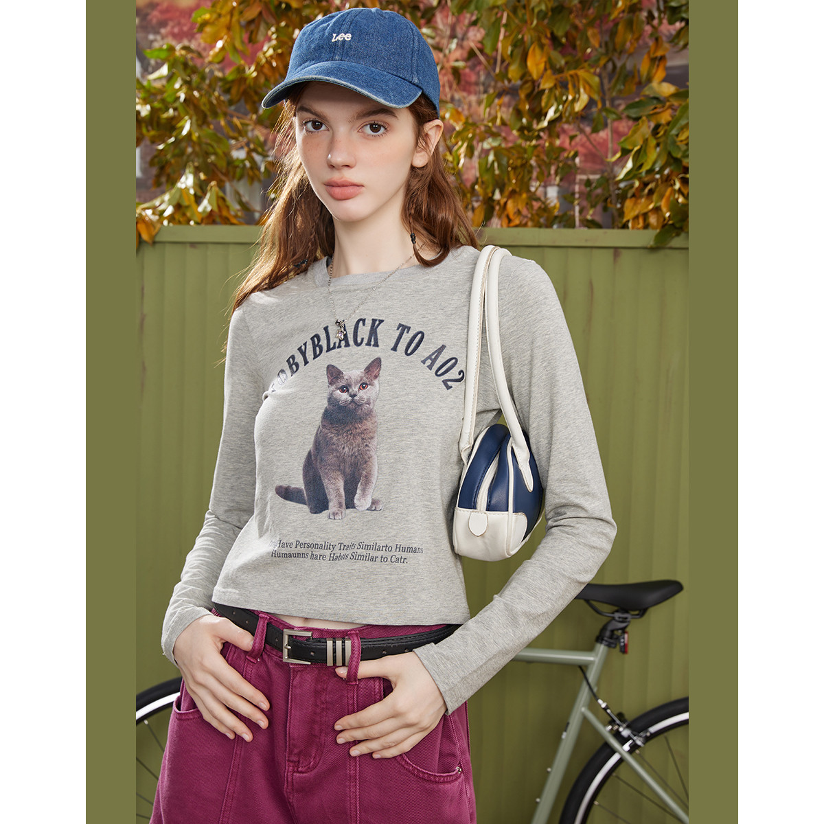 新猫咪总动员印花弹力长袖灰色百搭短款女式T恤 387101