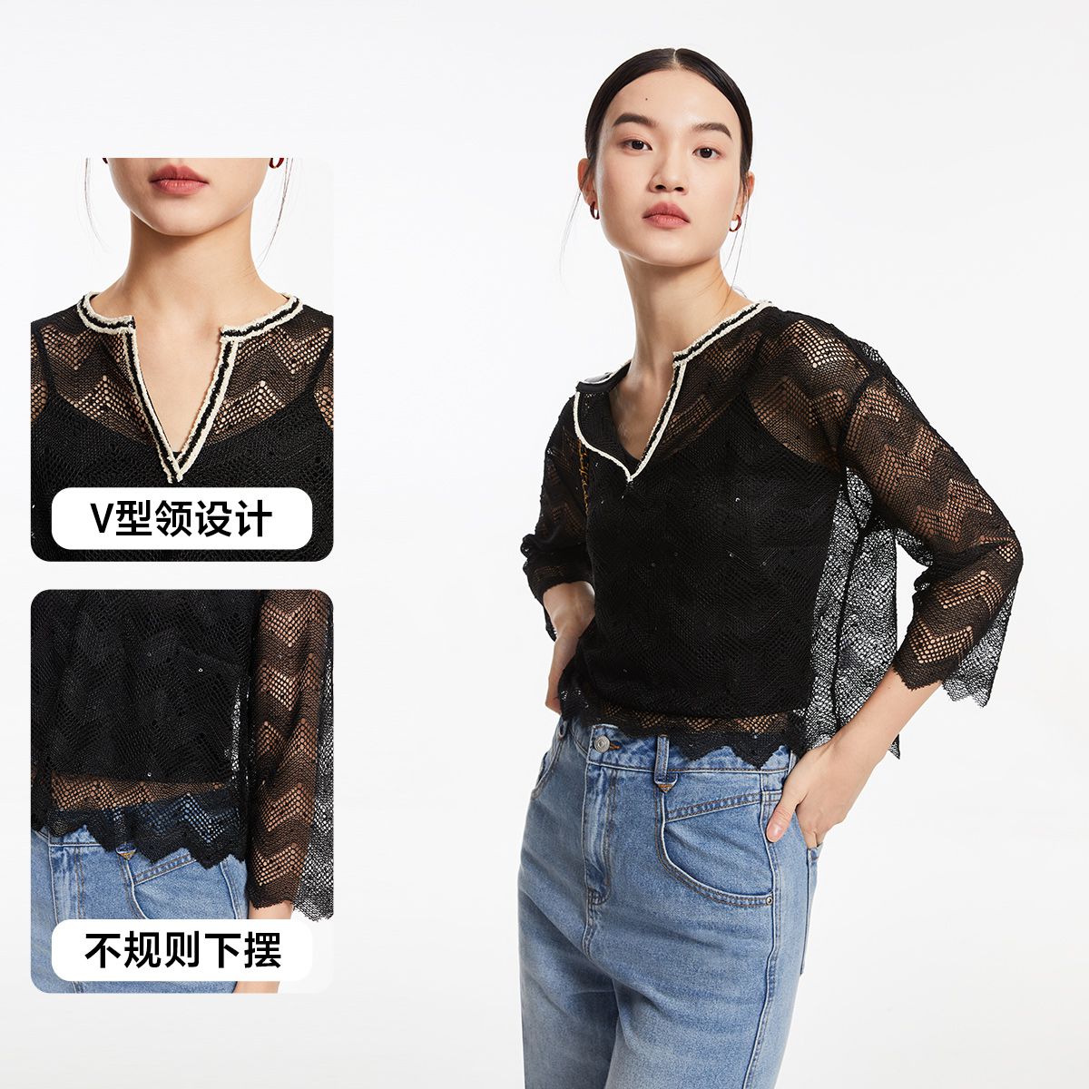 【秋专柜款】宽松圆领镂空编织七分袖优雅通勤T恤上衣女 331793