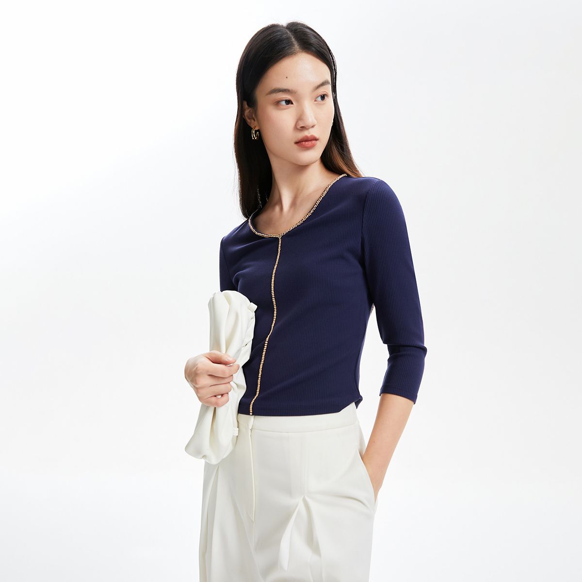 圆领七分袖T恤修身合体上衣女气质百搭时尚春夏 095825