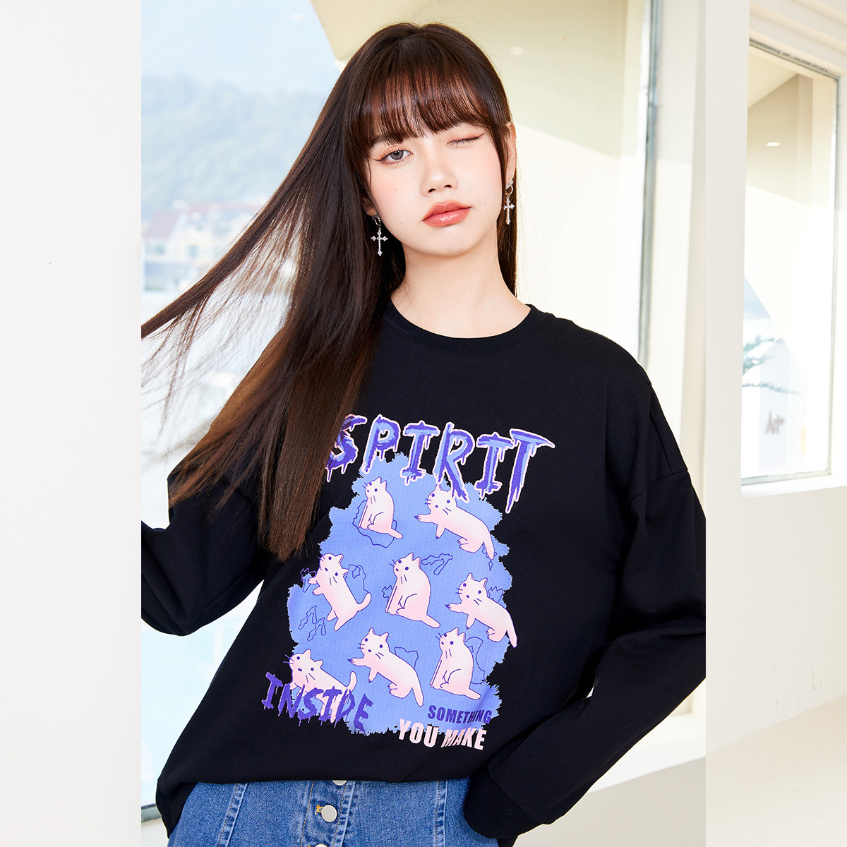 春秋卡通兔子印花圆领长袖T恤女时尚宽松原宿风上衣 750548