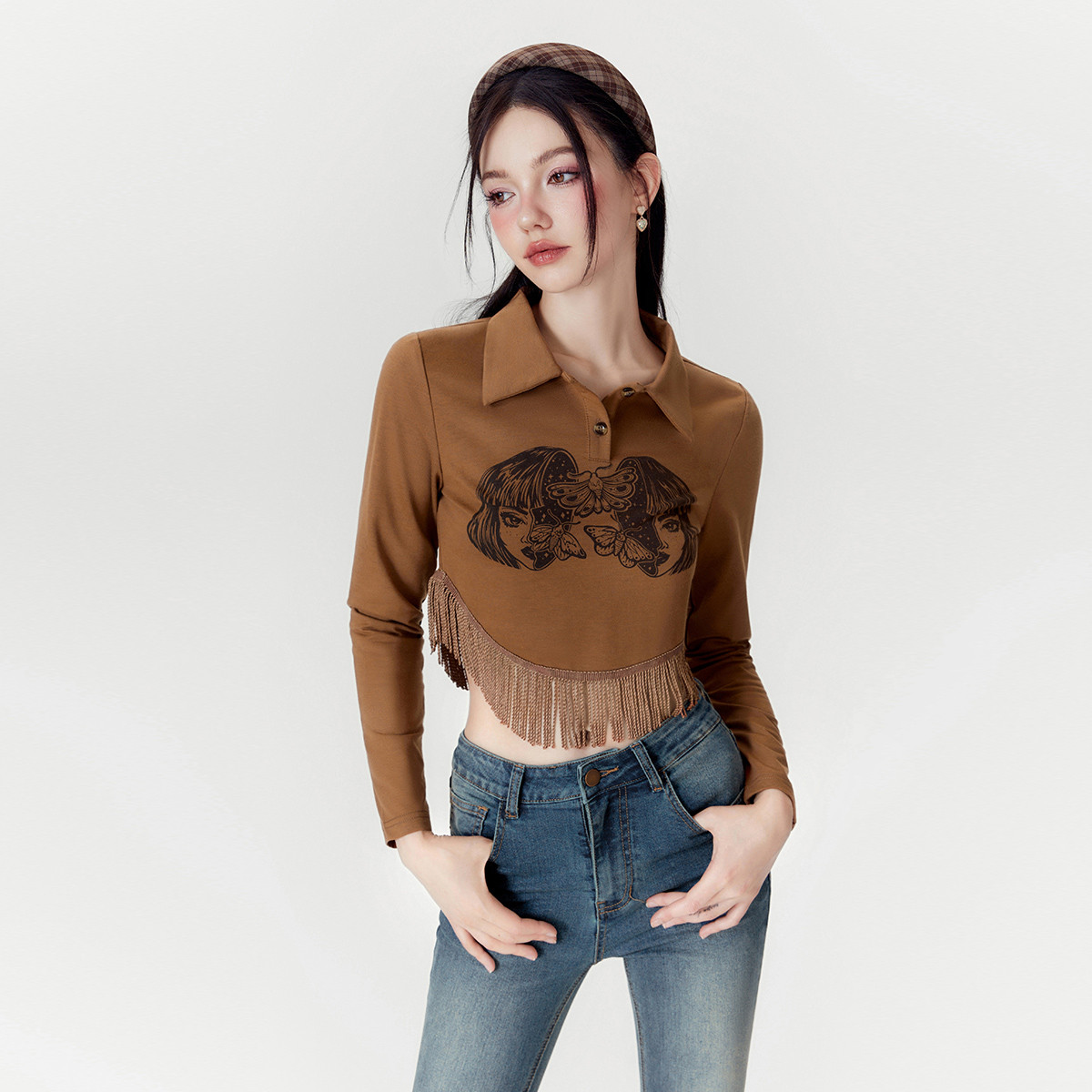 春秋复古辣妹翻领polo衫女不规则下摆长袖t恤 050964