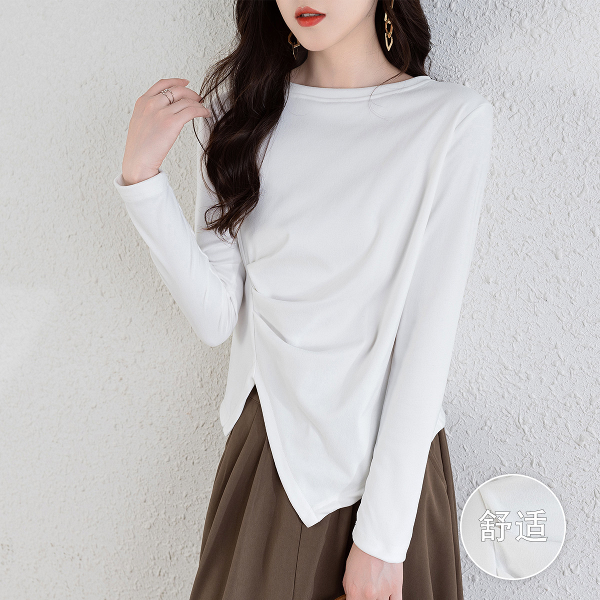 爆款热销春秋潮款不规则开叉褶皱长袖T恤女修身显高圆领女上衣潮 261953
