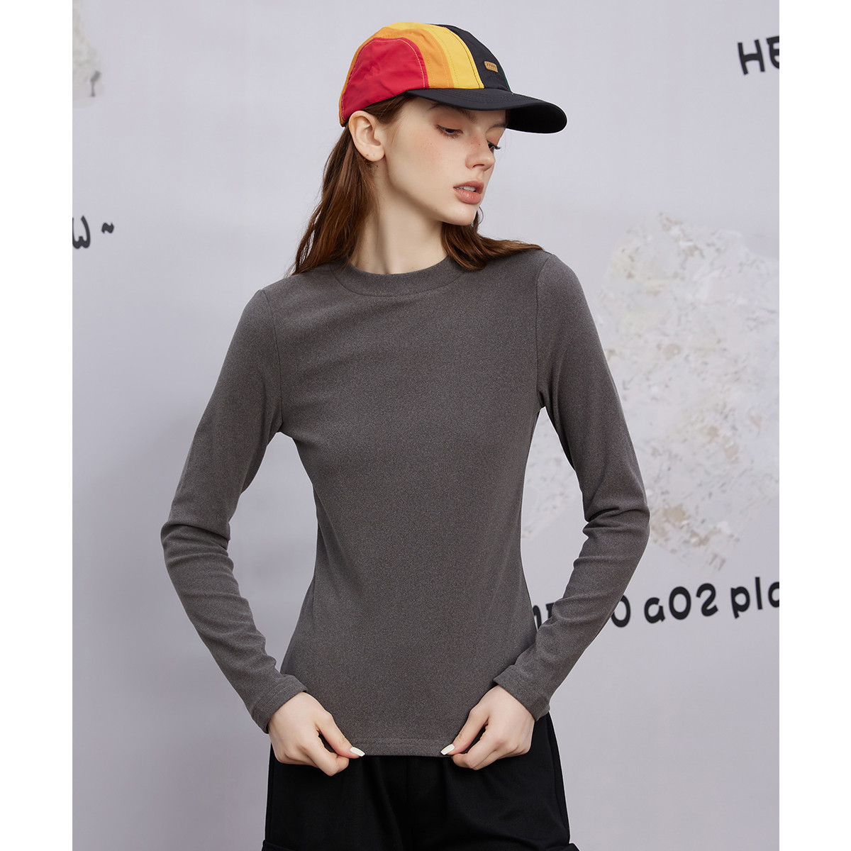 米子旗秋冬季圆领女士T恤纯色简约打底长袖上衣女 667290