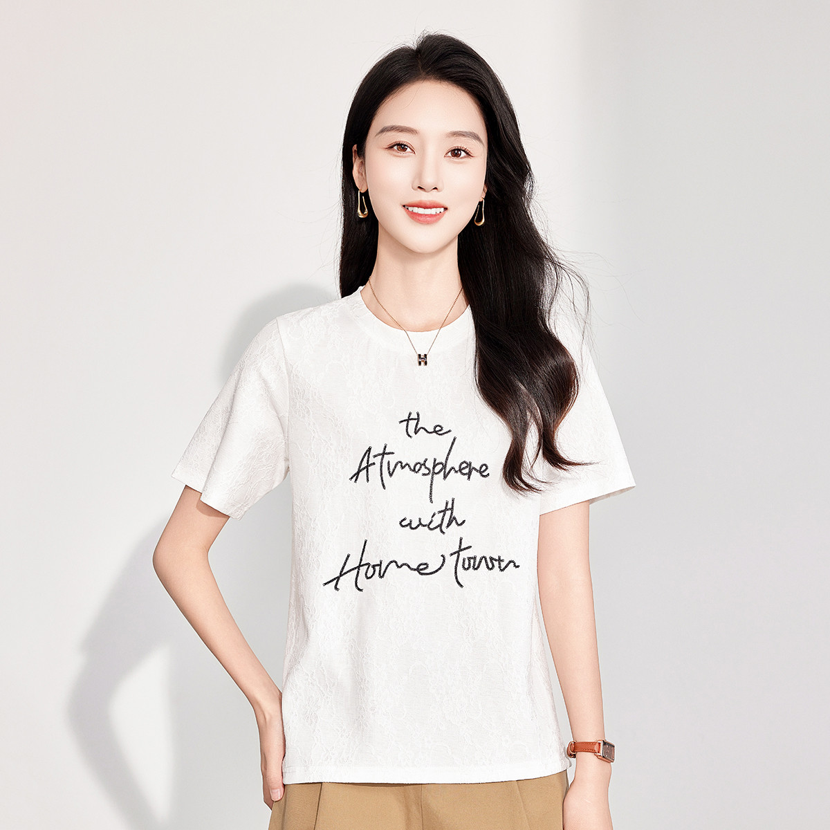 25夏季新款韩系高级感蕾丝压纱上衣女式温柔字母刺绣短袖T恤 274079