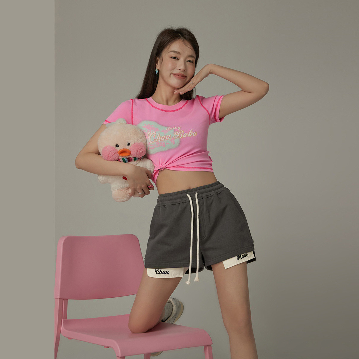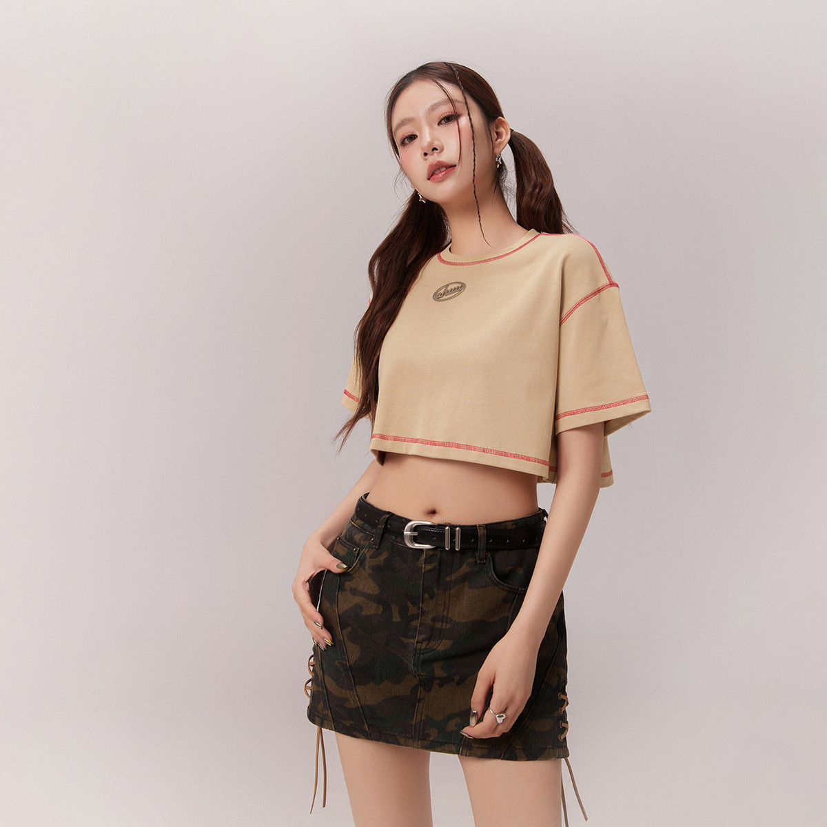 明线撞色落肩袖T恤女2025夏基础辣妹宽松露脐短款上衣 922963