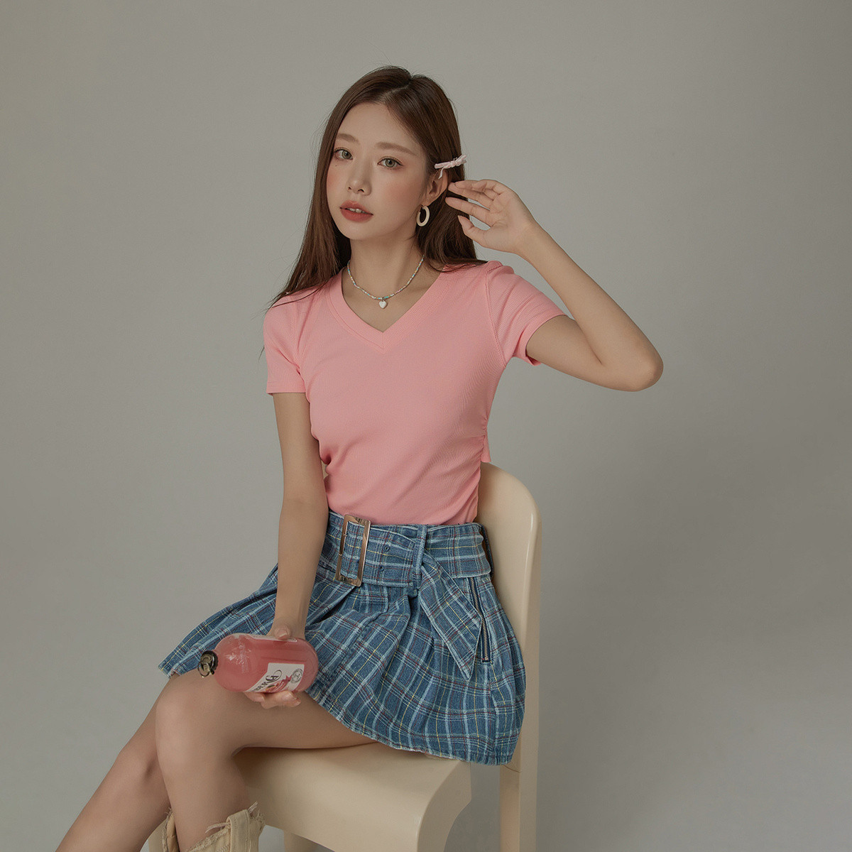 正肩短袖T恤女秋字母镂空系带抽褶V领纯色上衣薄 145491