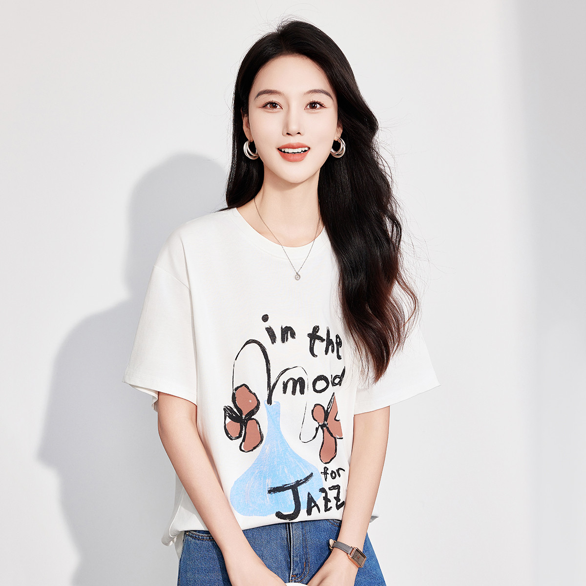 【100%棉】25夏季新休闲字母花瓶印花短袖T恤女式纯棉上衣 528223