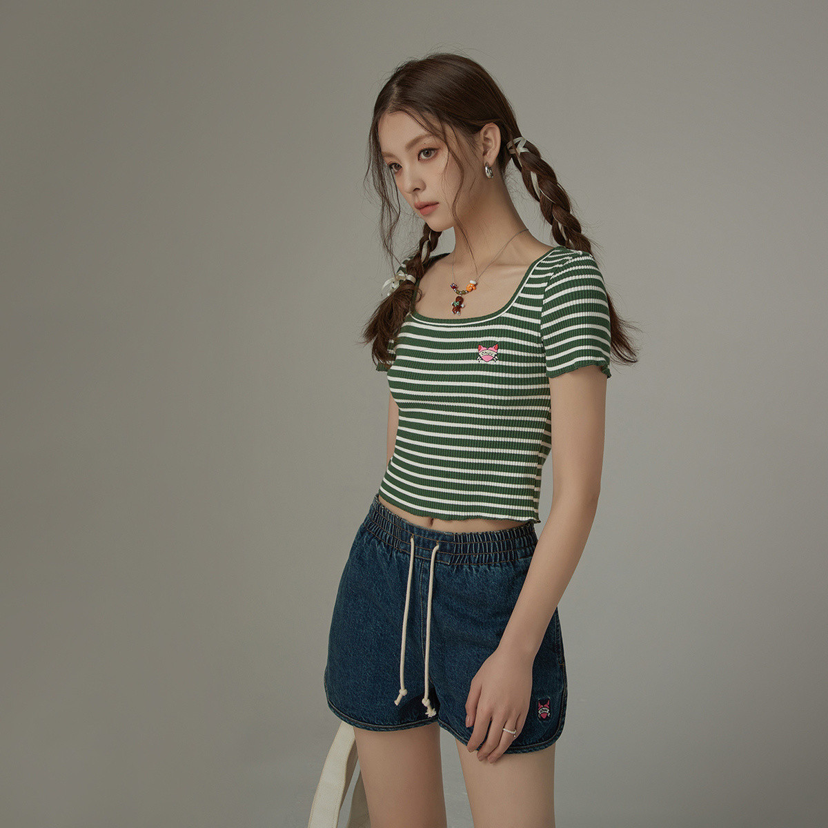 小狐狸刺绣短袖T恤女士春夏辣妹修身条纹短款上衣 898195