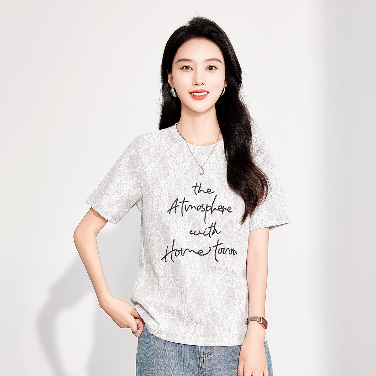 25夏季新款韩系高级感蕾丝压纱上衣女式温柔字母刺绣短袖T恤 290463