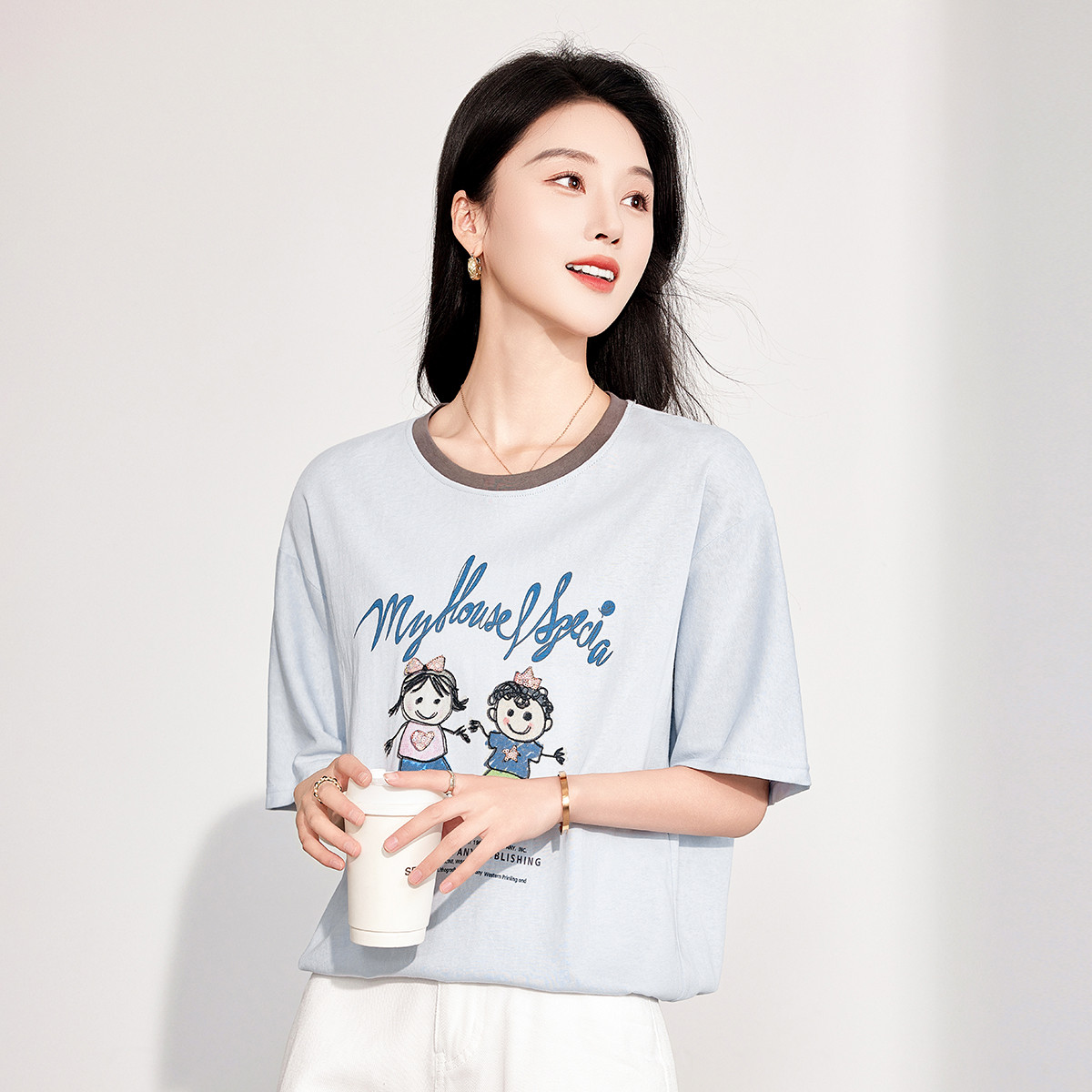 美式刺绣宽松圆领撞色短袖上衣2025夏季百搭休闲女式T恤 307997