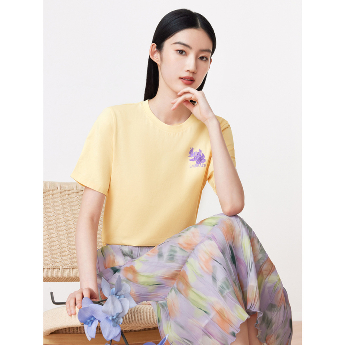 玖姿夏季简约圆领鸢尾花刺绣串珠T恤女 059148