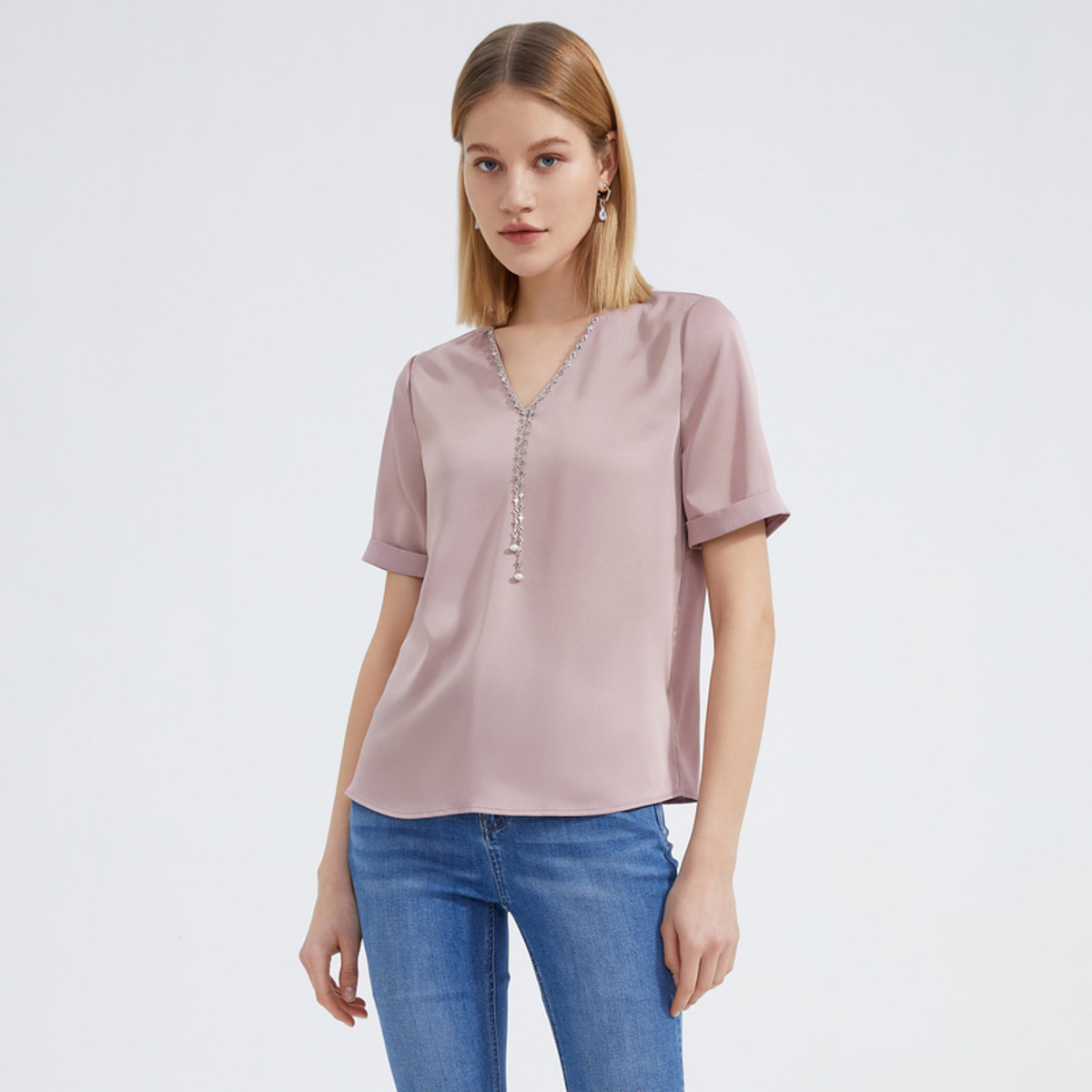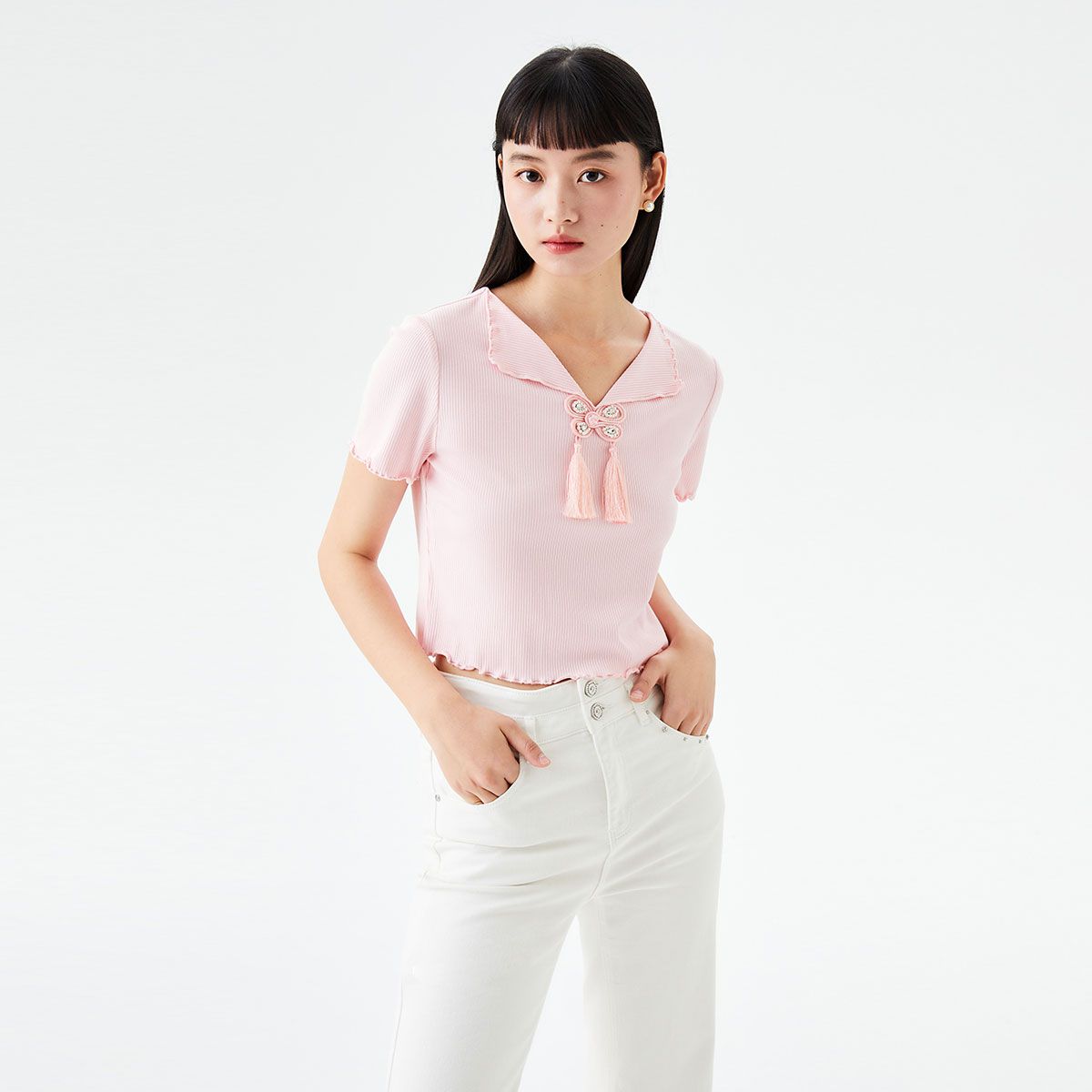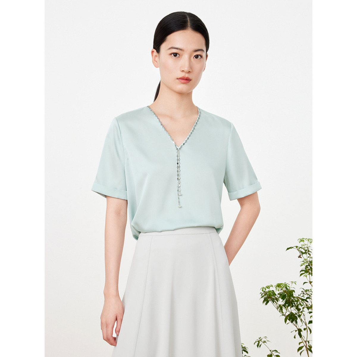 玖姿夏季简约纯色V领翻边袖短袖T恤女 249420