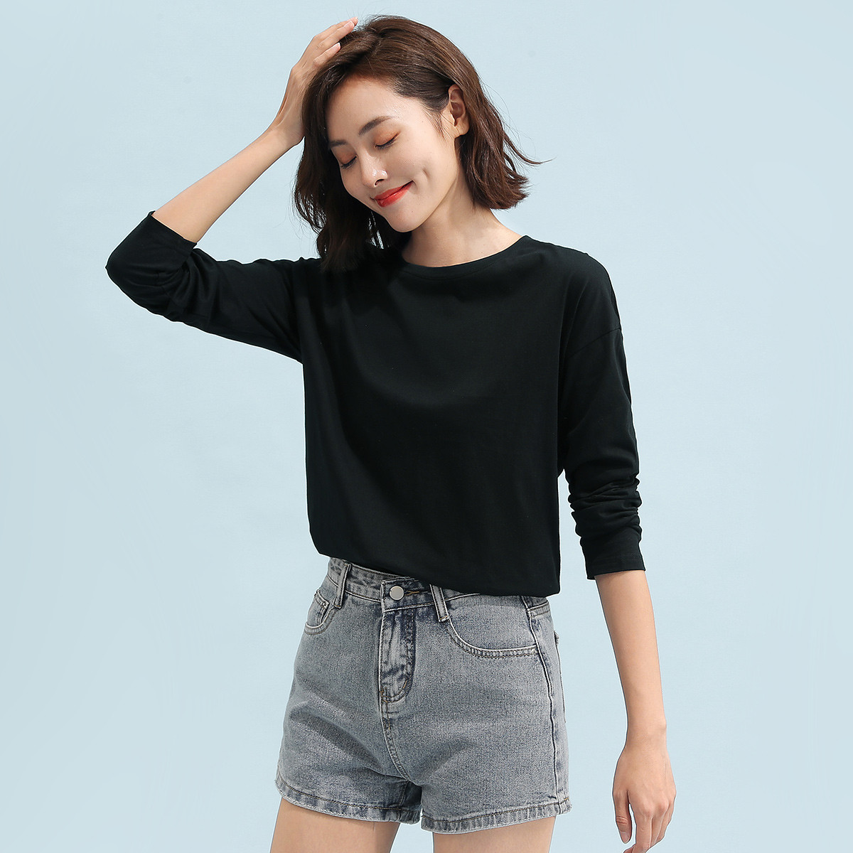 米子旗春秋款修身纯色T恤女韩版百搭长袖上衣 228442