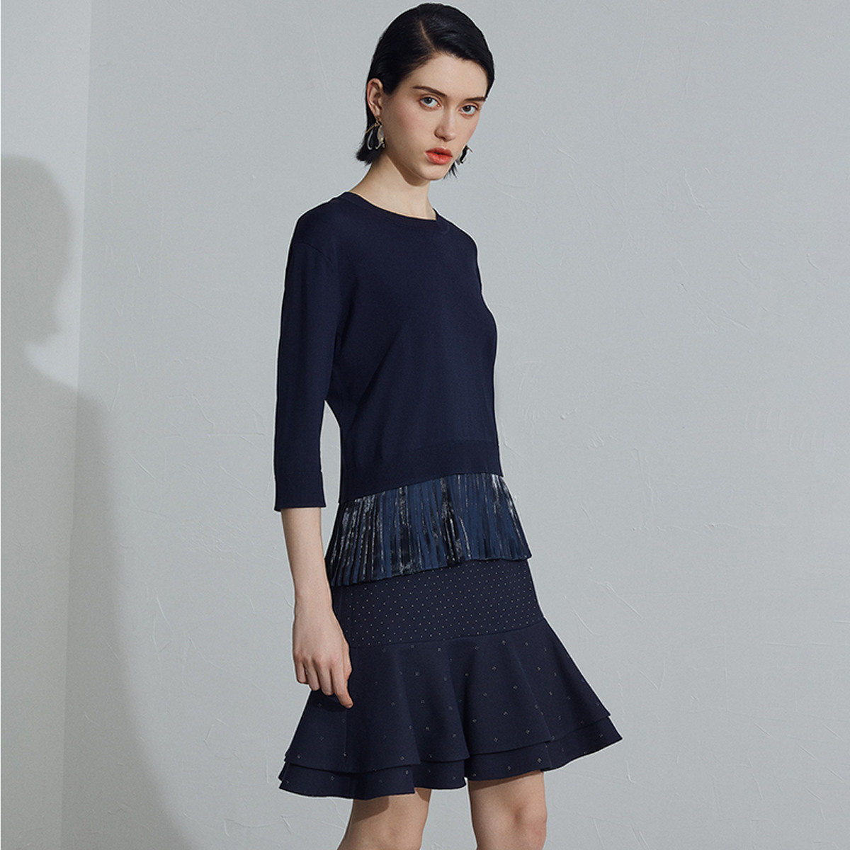 宝姿PORTS女装针织中袖圆领拼接针梭百褶套头衫 041290