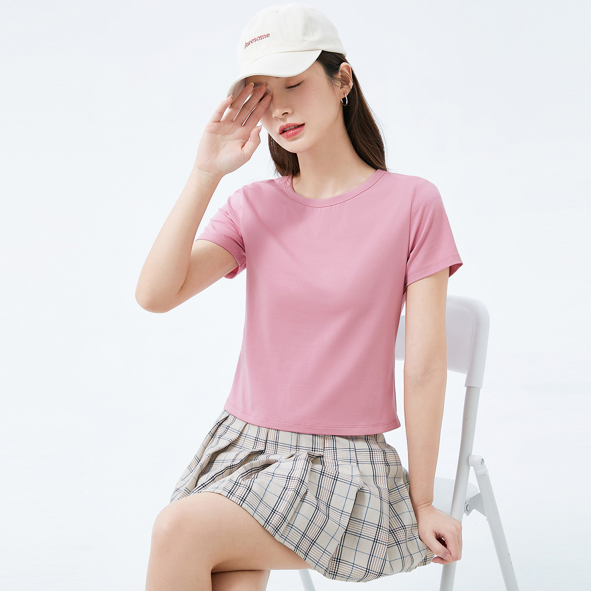 米子旗春秋圆领女式T恤纯色短款短袖上衣简约百搭 442970