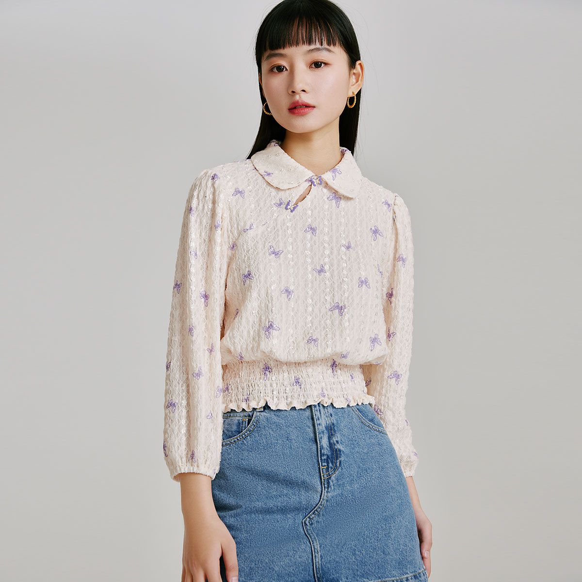 【精美立体蝴蝶装饰】专柜同款七分泡泡袖气质翻领印花上衣 118481