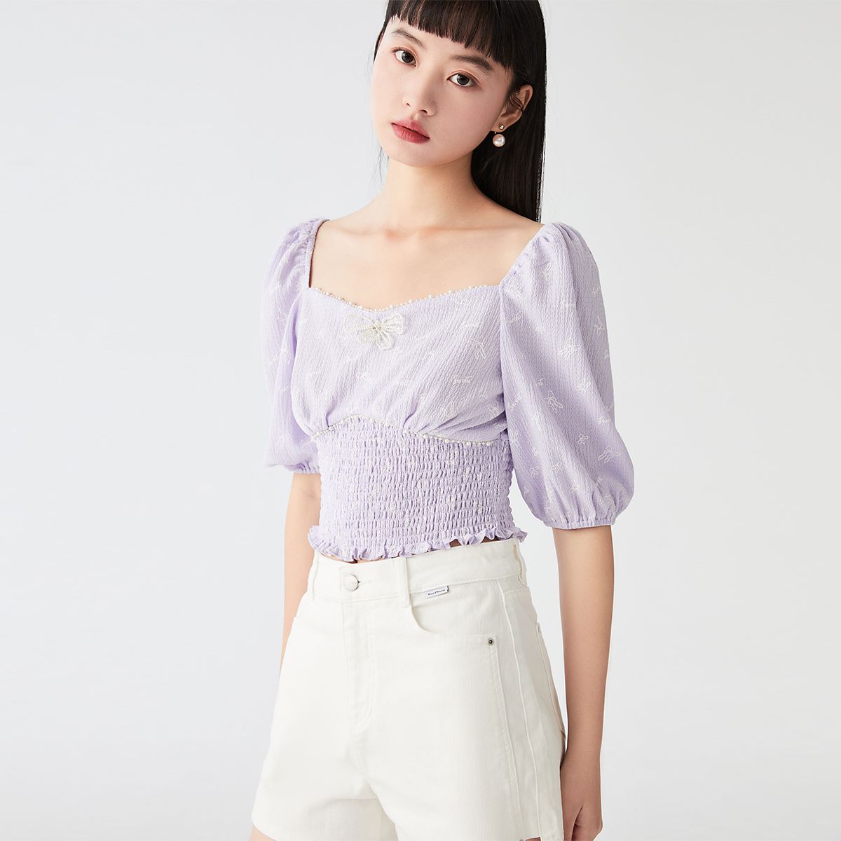 【方领泡泡袖】春夏减龄蝴蝶结印花收腰设计优雅短款T恤上衣女 224017