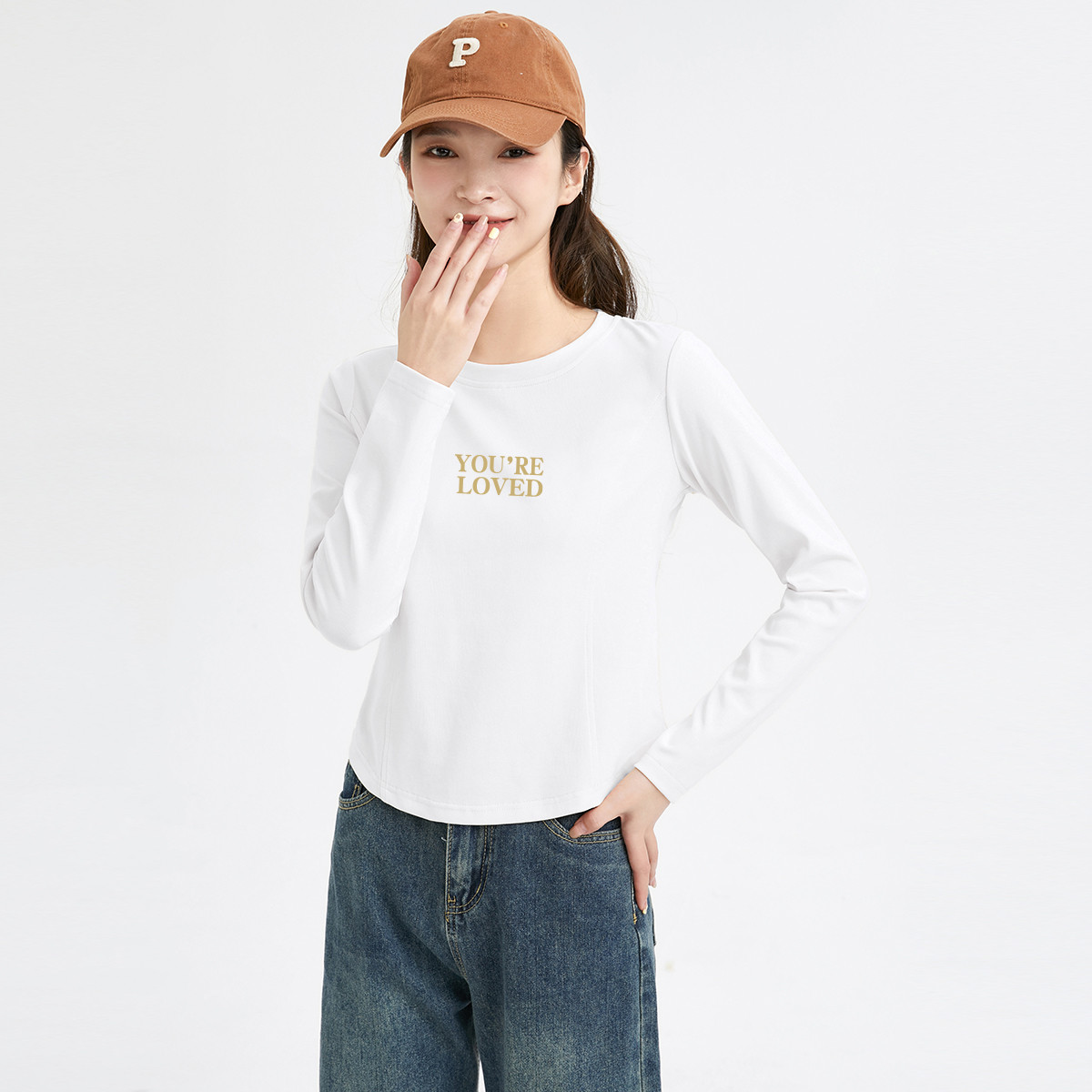 米子旗春秋款圆领女式T恤纯色宽松下摆开叉设计长袖上衣 544474
