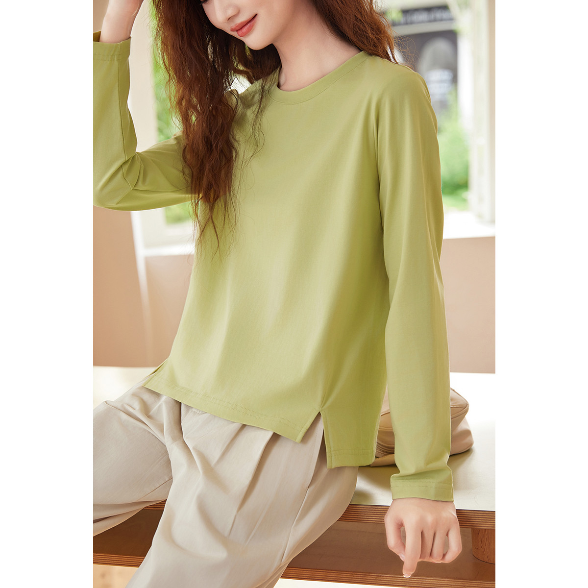 米子旗春秋款圆领女式T恤纯色宽松下摆开叉设计长袖上衣 483034