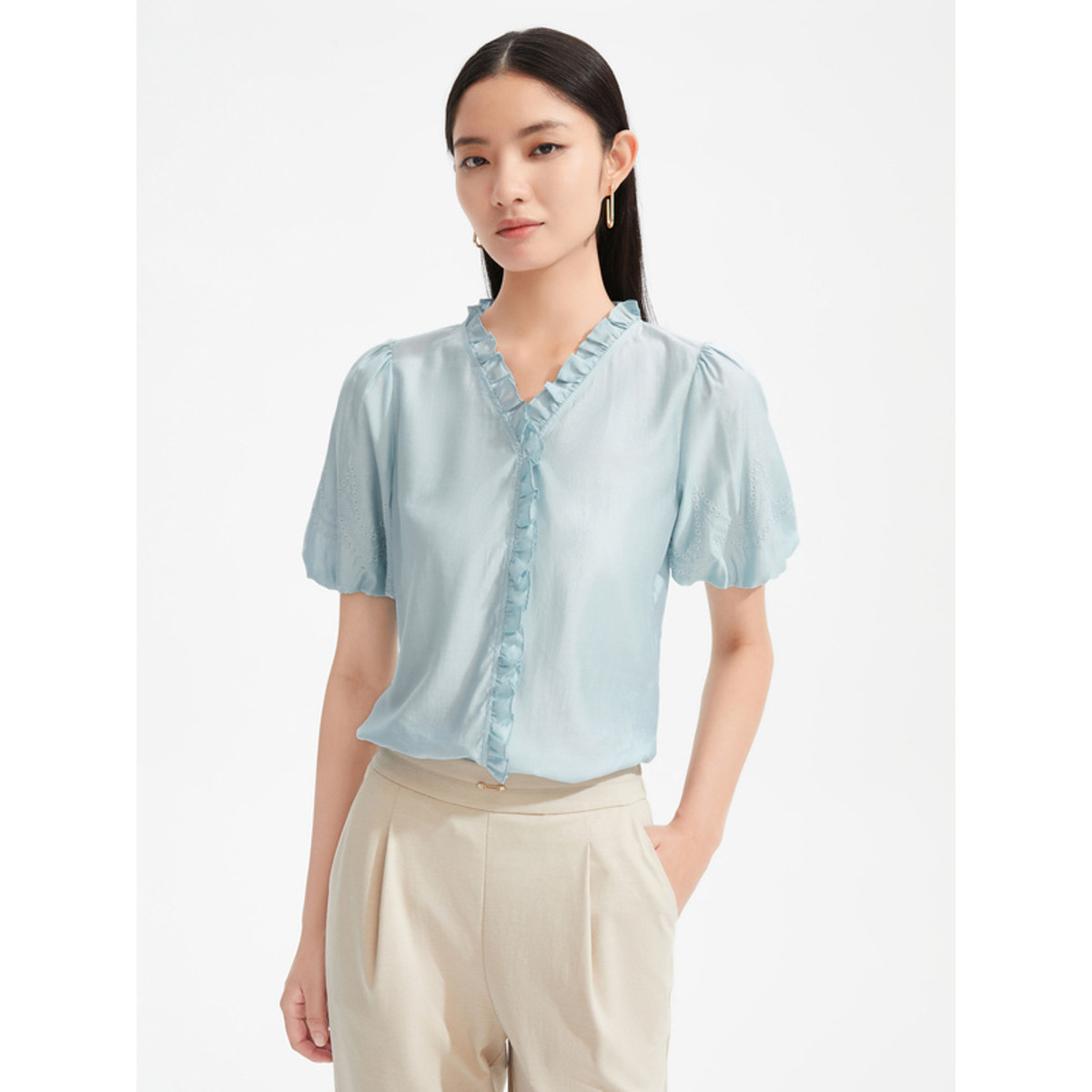 JZ玖姿夏季复古宫廷风木耳边泡泡袖女式T恤 737868