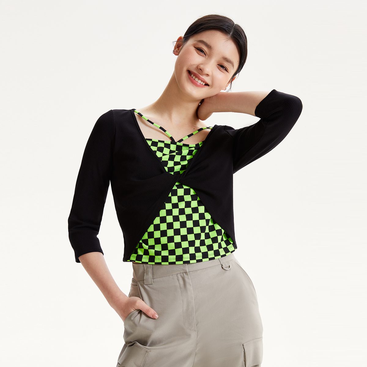 【假两件】春夏专柜款格纹印花拼接打结七分袖休闲上衣百搭时尚 268113