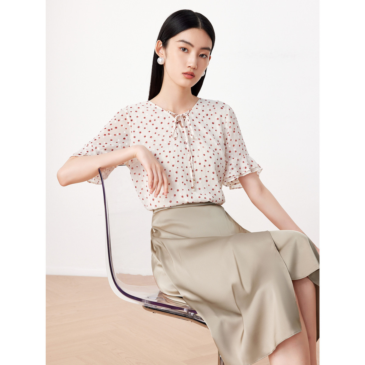 玖姿夏季时尚V领荷叶边波点雪纺T恤女 689228