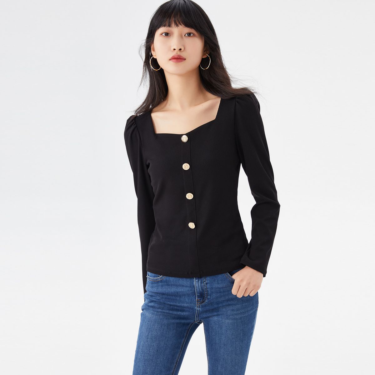 【一字领设计】夏季一字领弹力修身短款长袖T恤女 690970