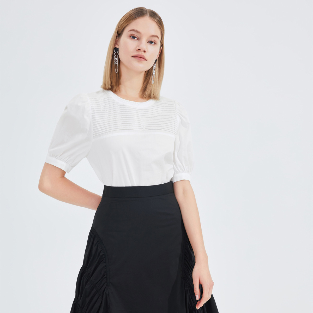 JZ玖姿夏季简约纯色泡泡袖圆领塔克艺术女式T恤 440012