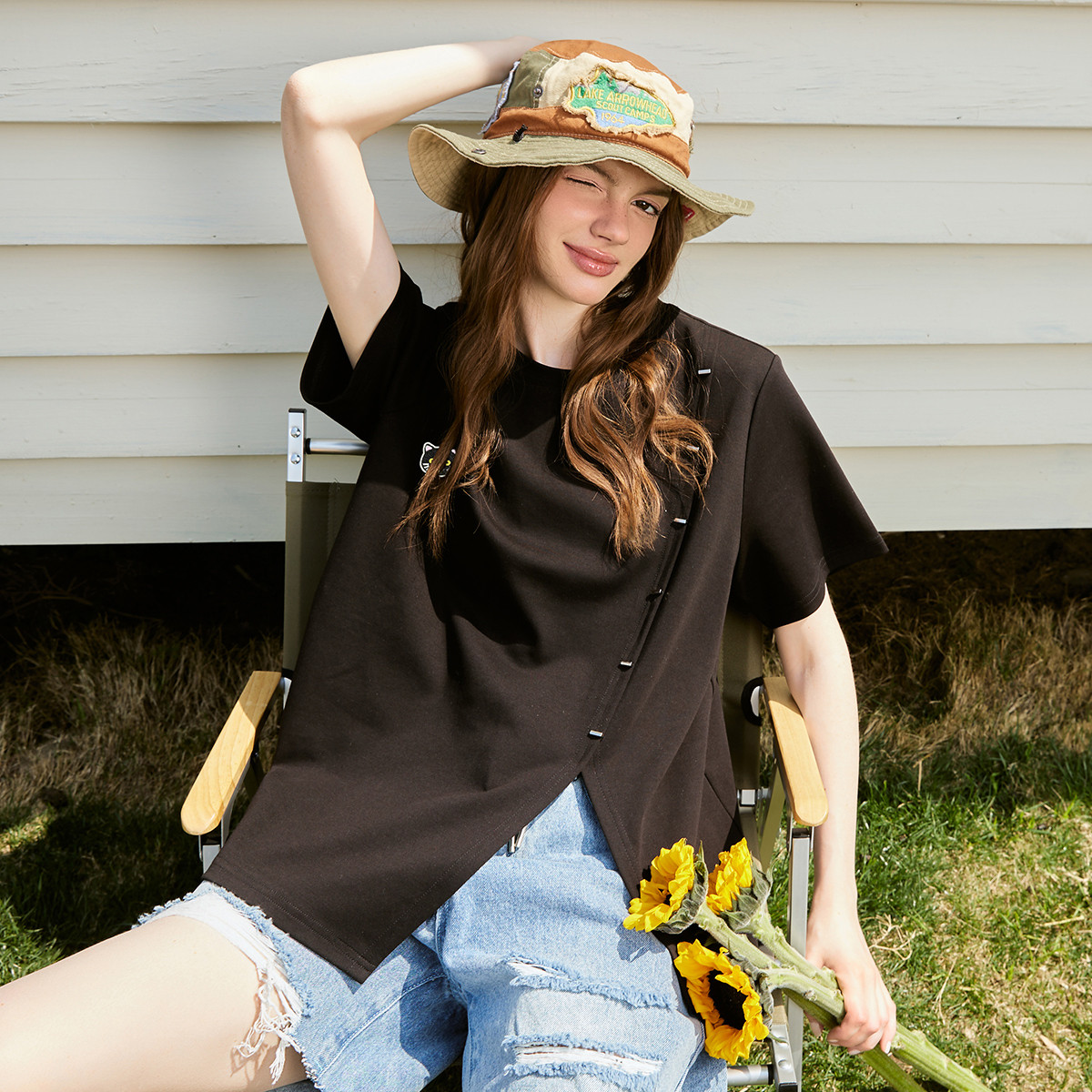 夏季不规则拼接版型下摆开口个性刺绣女式T恤 289565