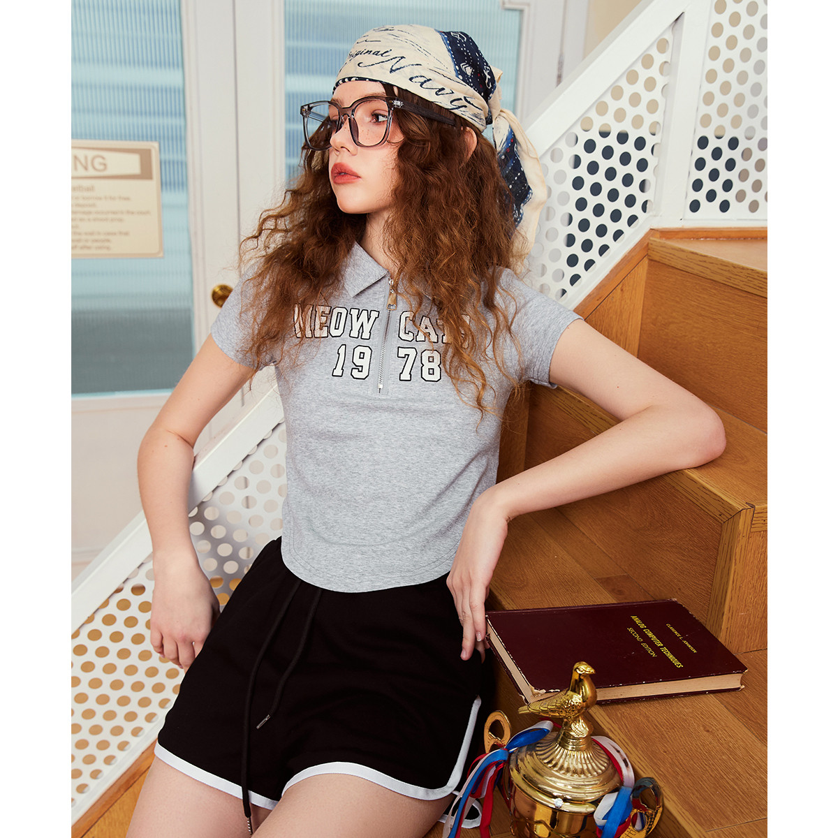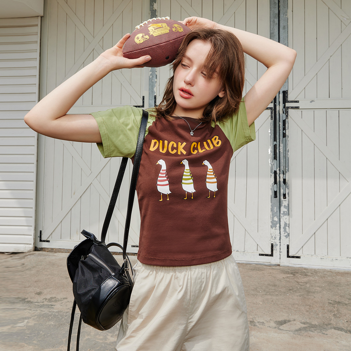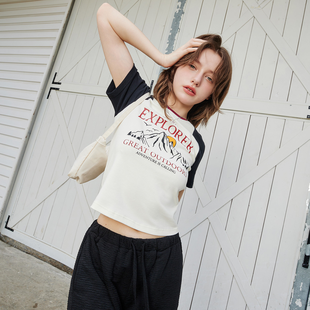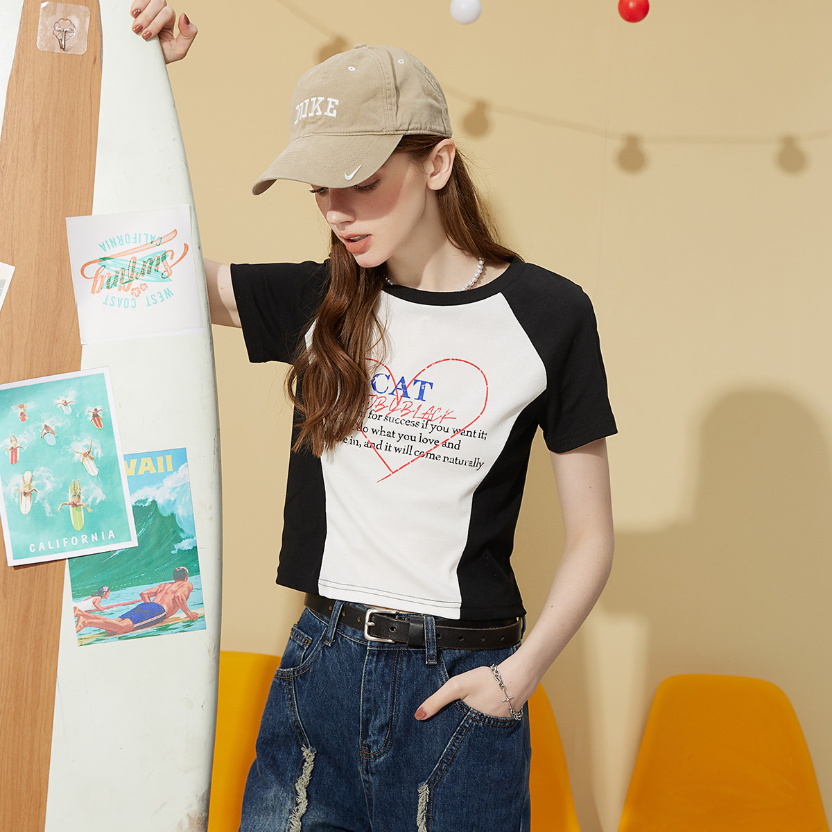 夏季撞色拼接显瘦小短款胸前印花做旧女式T恤 492957